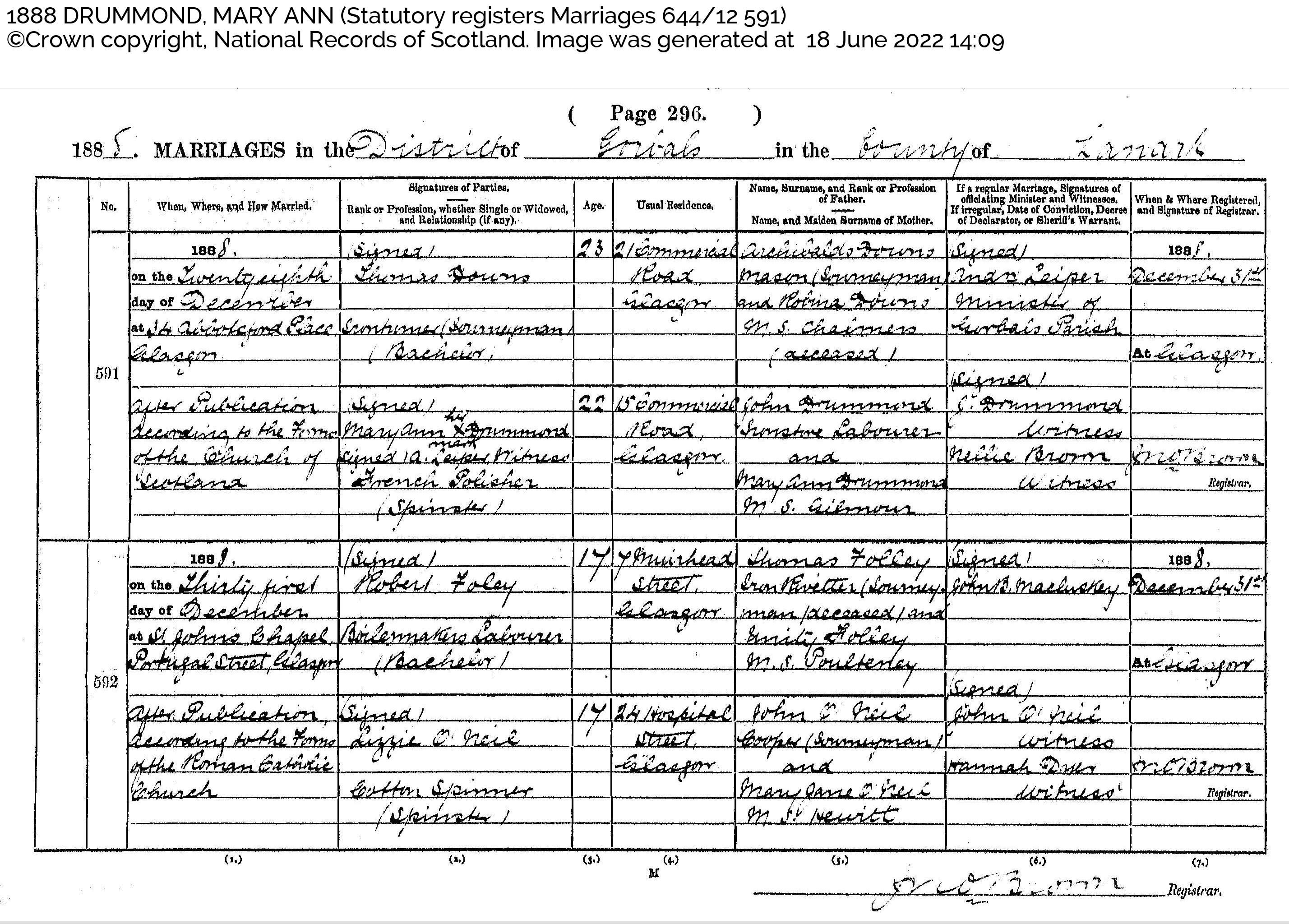 Thomas Downs and Mary Ann Drummond married 28th December 1888 at 24 Abbotsford Place, Glasgow after Publication according to the Forms of the Church of Scotland. He is said to be aged 23 and an Iron Turner (Journeyman) the son of Archibald Downs, Mason (Journeyman) and Robina Downs ms Chalmers (deceased). His usual residence is 21 Commercial Road, Glasgow. It is signed by Andrew Leiper Minister of Gorbals Parish and registered 31st December 1888