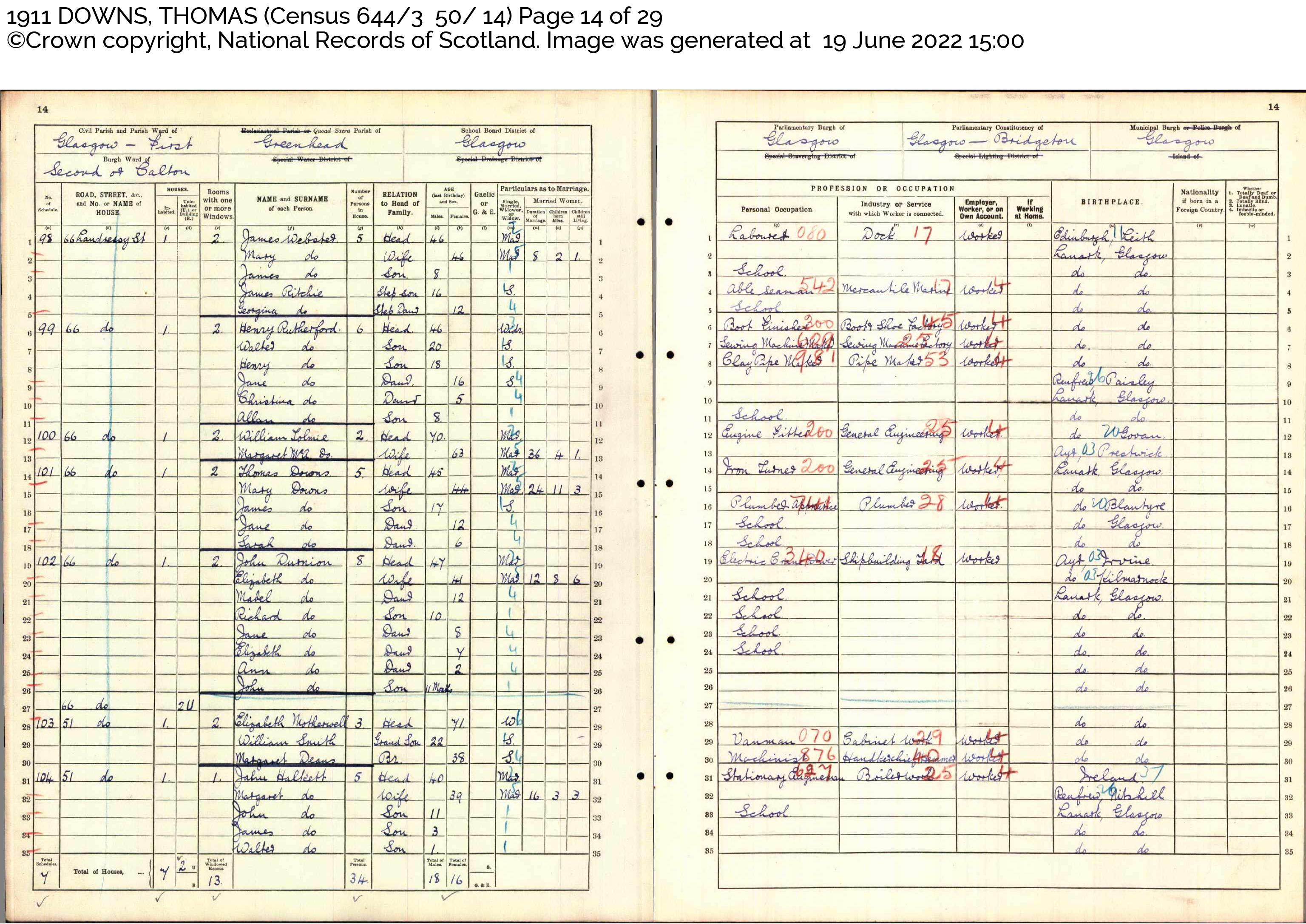 Downs, Thomas Head Married M 45 Iron Turner, General Engineering Glasgow, Lanarkshire