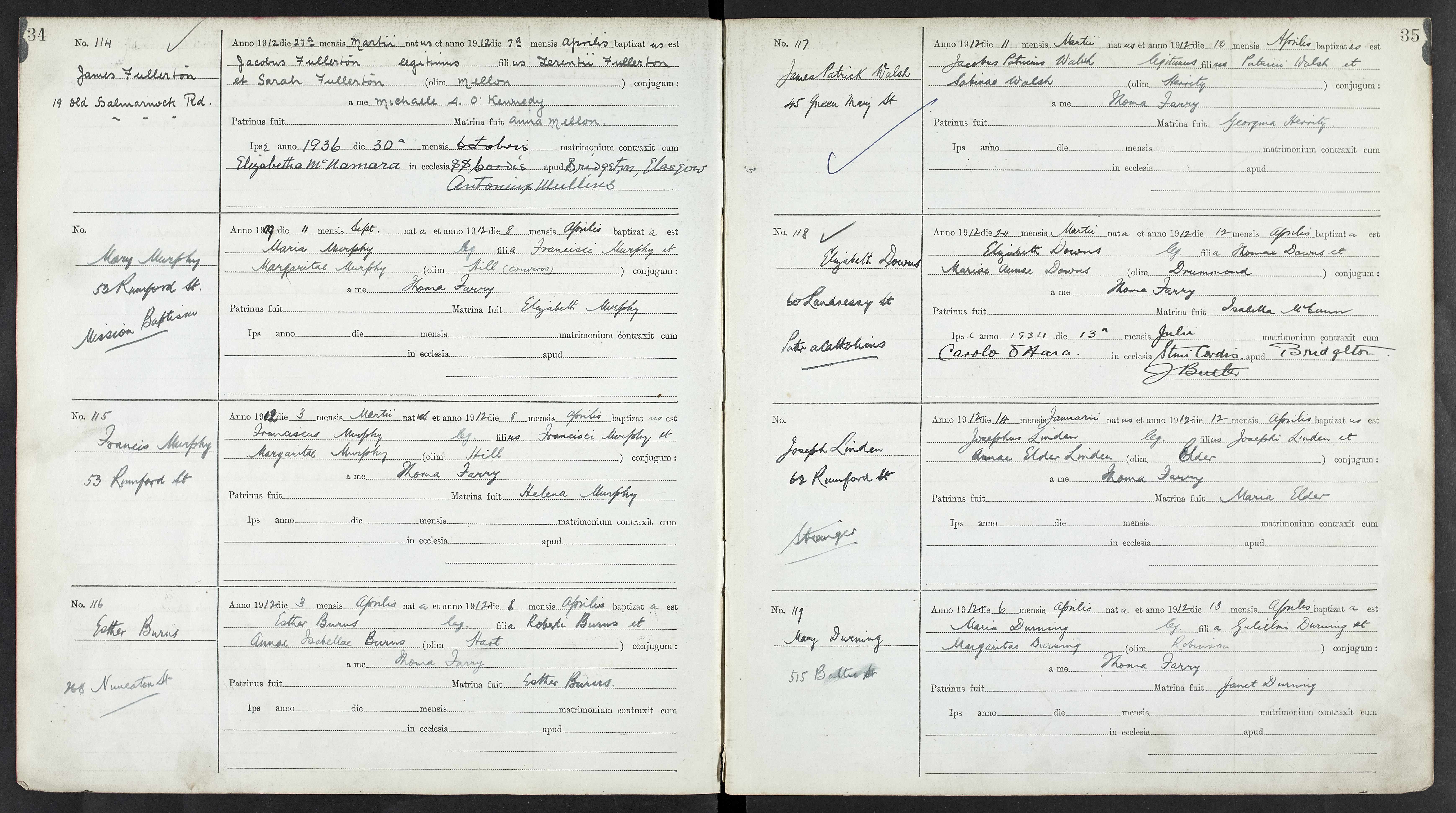 Elizabeth Downs was born 24 Mar 1912 and baptised 12 Apr 1912 in the parish of Sacred Heart, Glasgow, Bridgetown. Her address given is 60 Landressy Street, Bridgeton, Glasgow