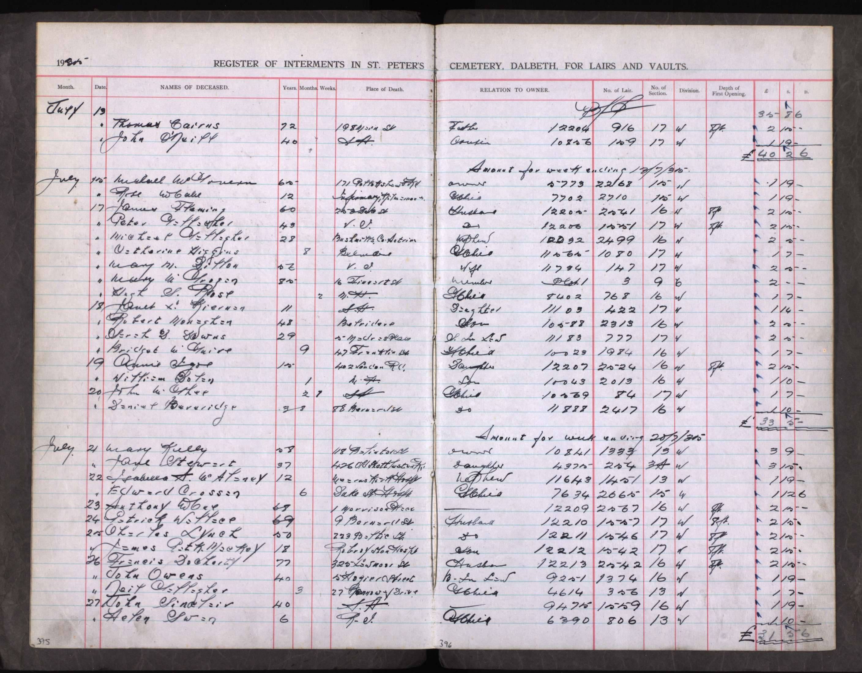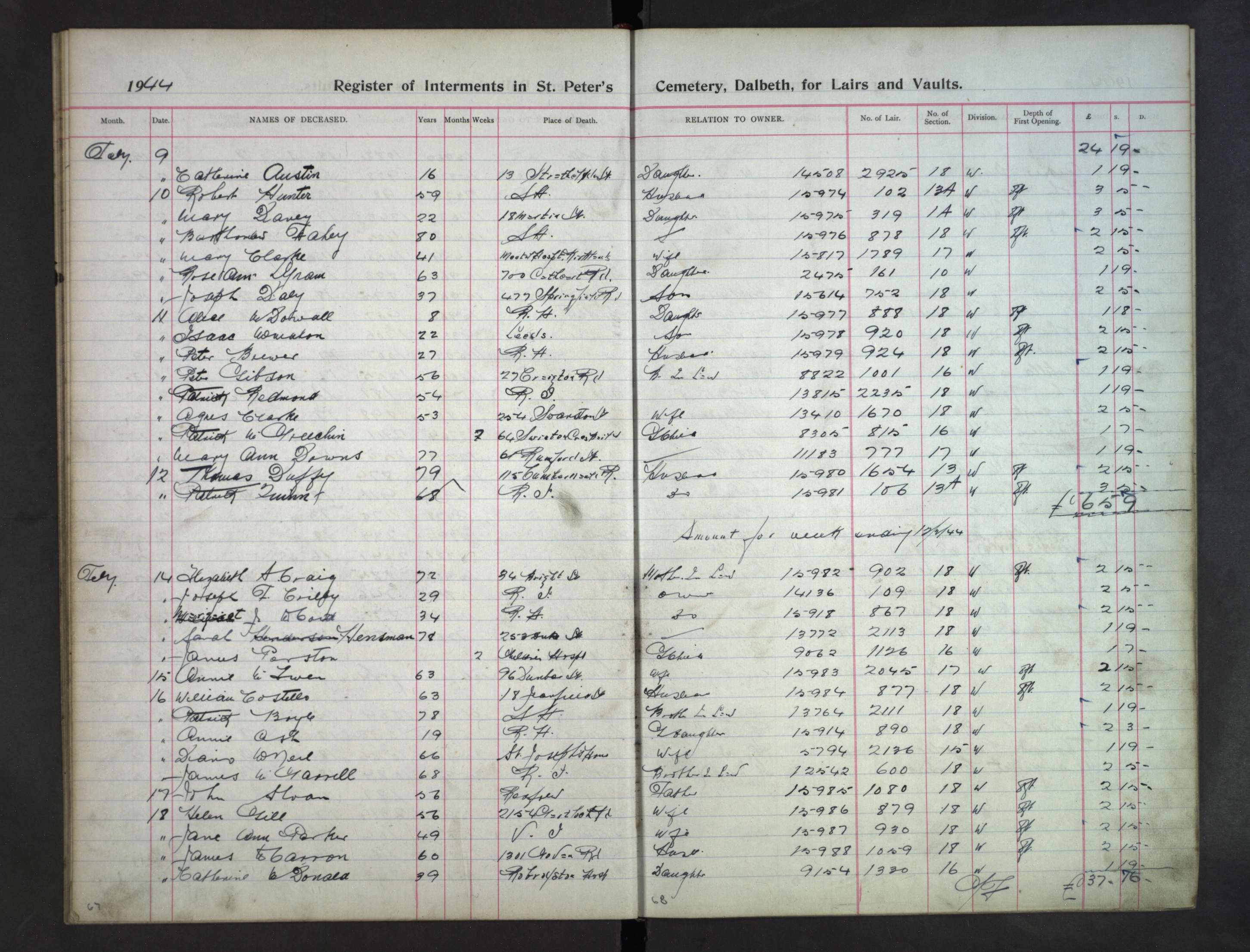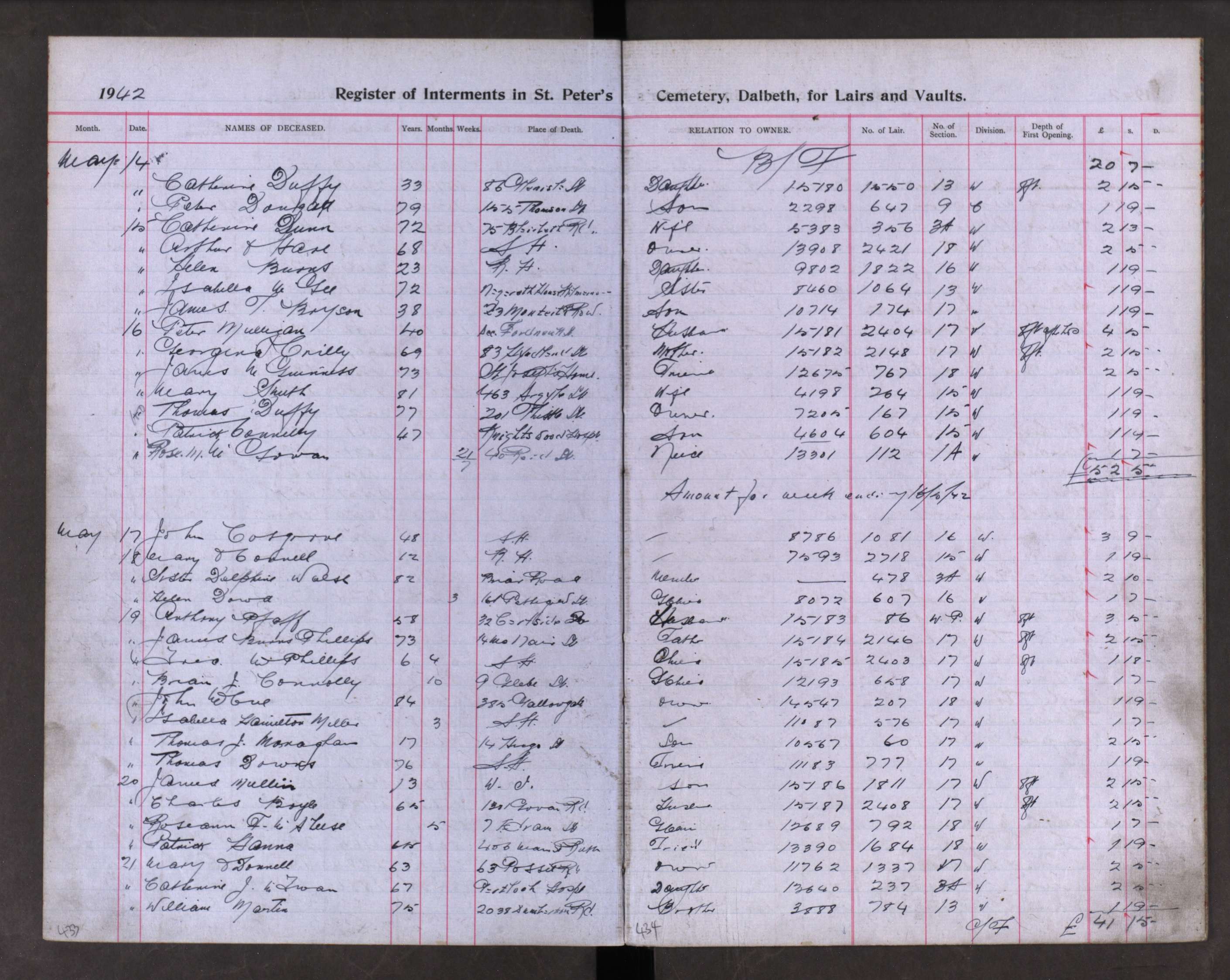 Thomas Downs died aged 76 and was buried on 19 May 1942 at St Peter's Cemetry , Dalbeath