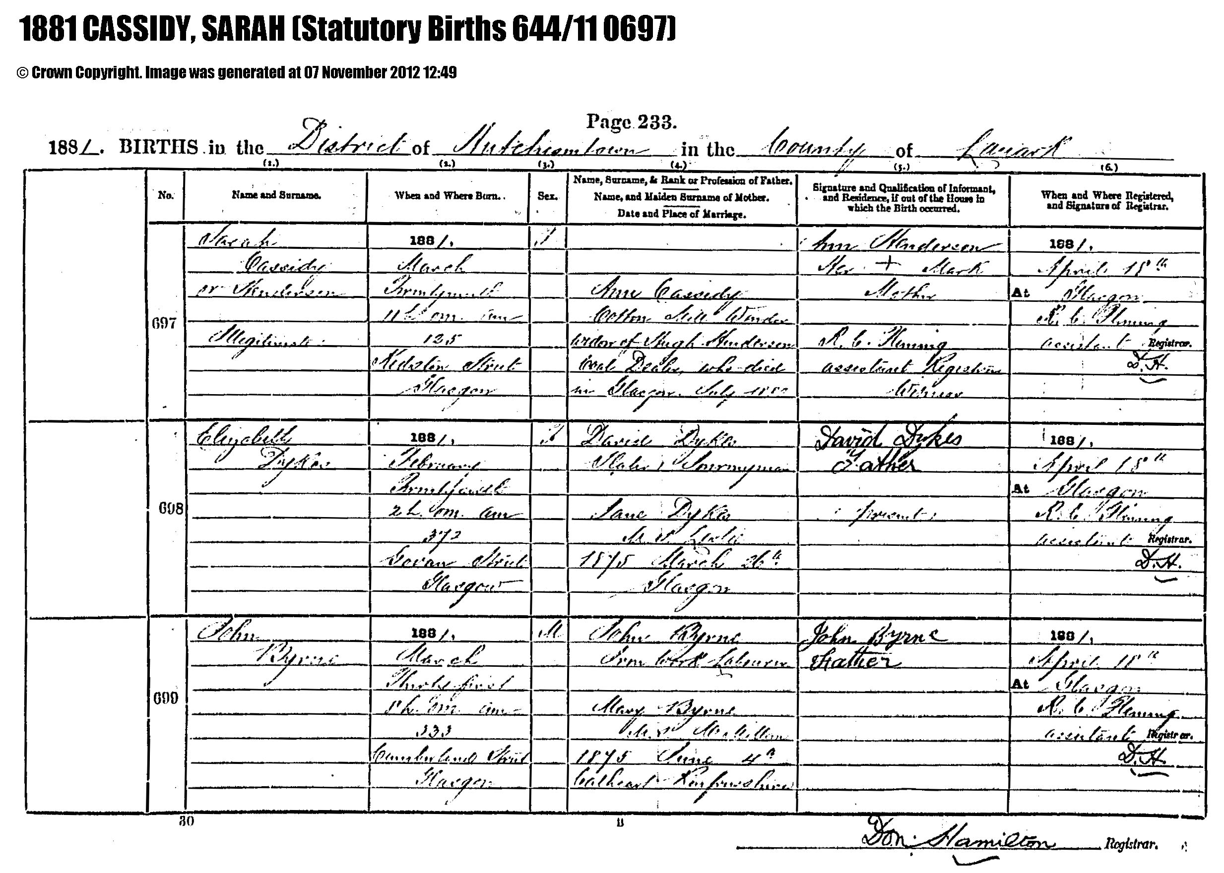 I SSBR source_N025.jpg Birth Birth of Sarah Cassidy 29 March 1881 19 3 1881