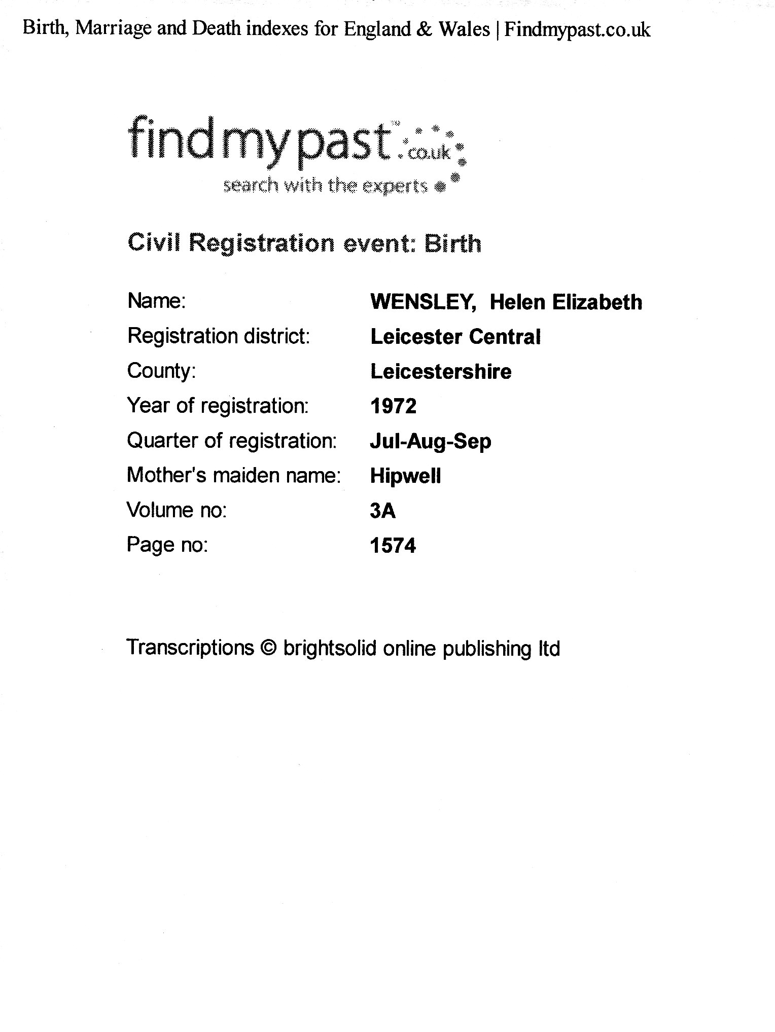 WS ESBR source_N067.jpg Birth Birth of Helen Elizabeth Wensley, 14 July 1972 14 7 1972