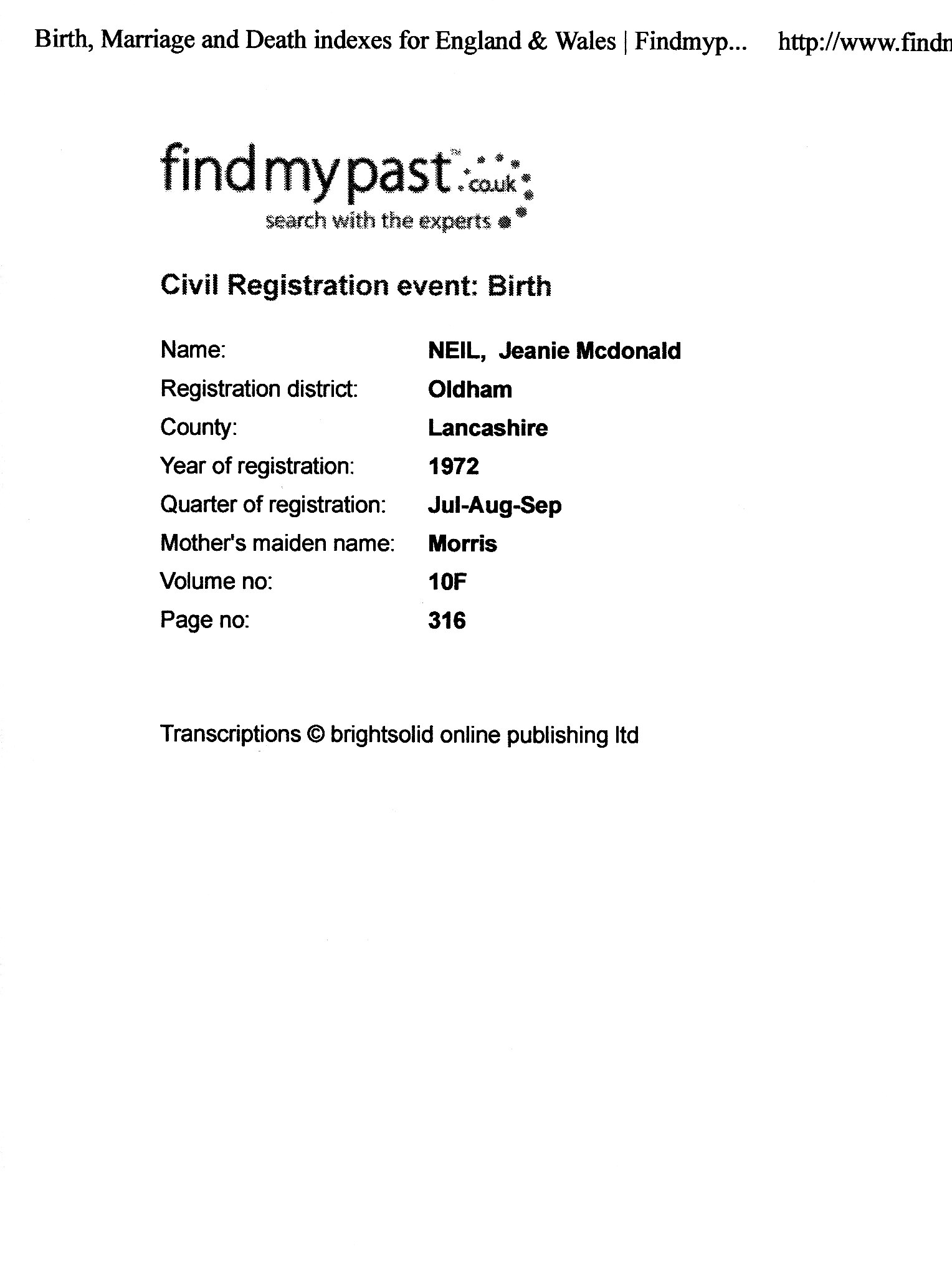 WS ESBR source_N074.jpg Birth Birth of Jeannie McDonald Neil 13th August 1972 13 8 1972