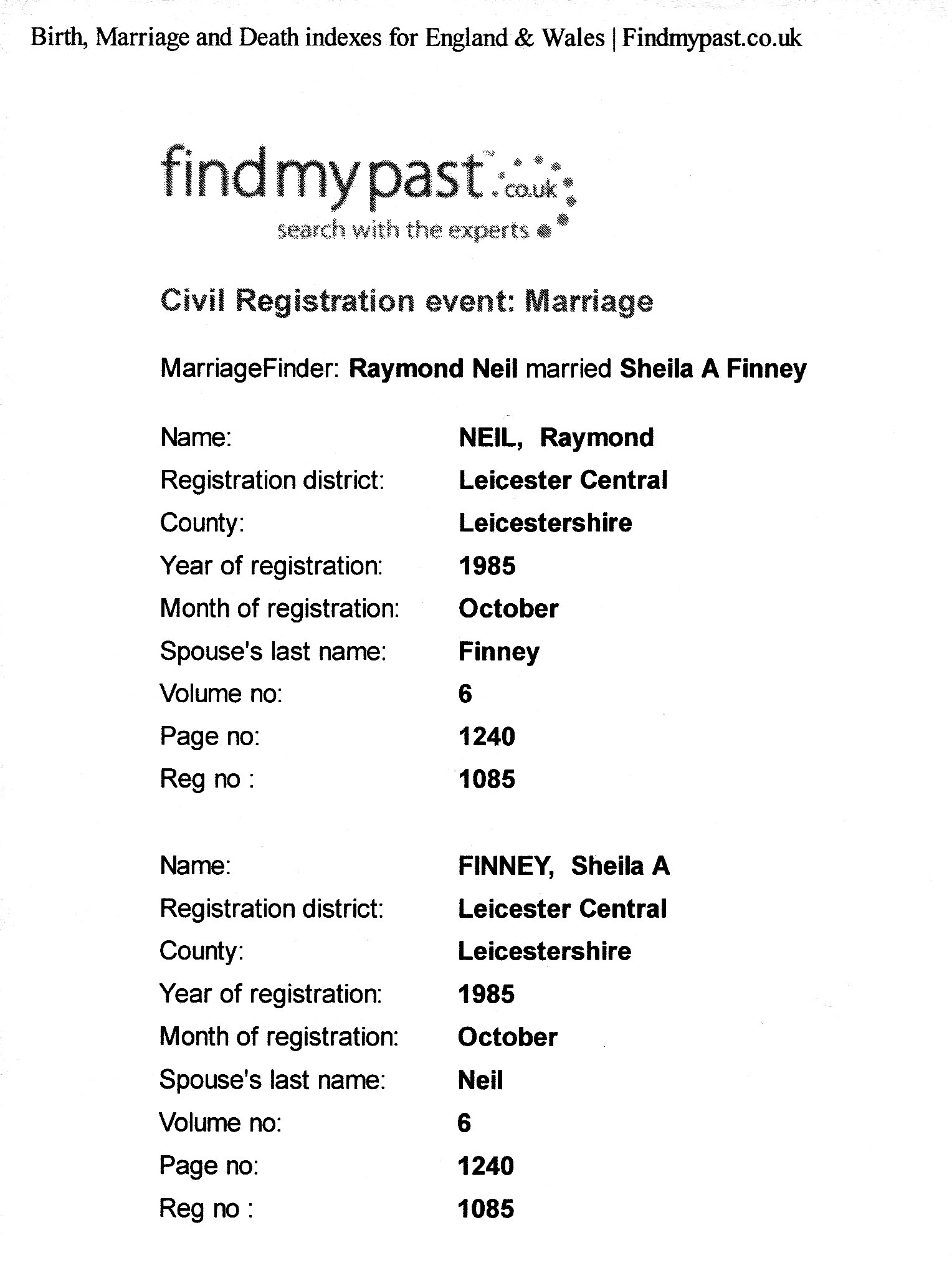 WS ESMR source_N078.jpg Marriage Marriage of Raymond Neil to Sheila A Finney October 1985     1985