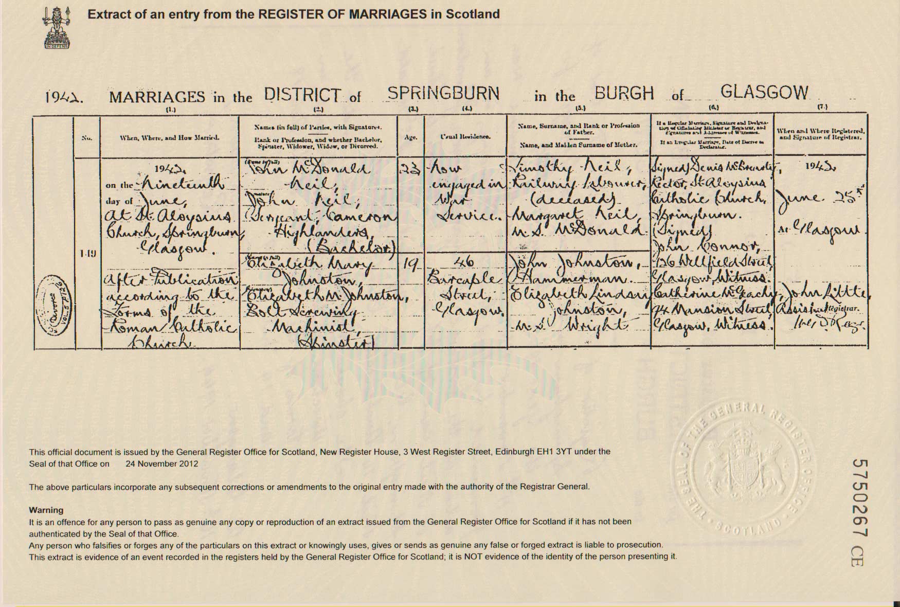 E SSMR source_N085a.jpg Marriage Marriage of John McDonald Neil and Elizabeth Mary Johnston, 19th June 1942 19 6 1942