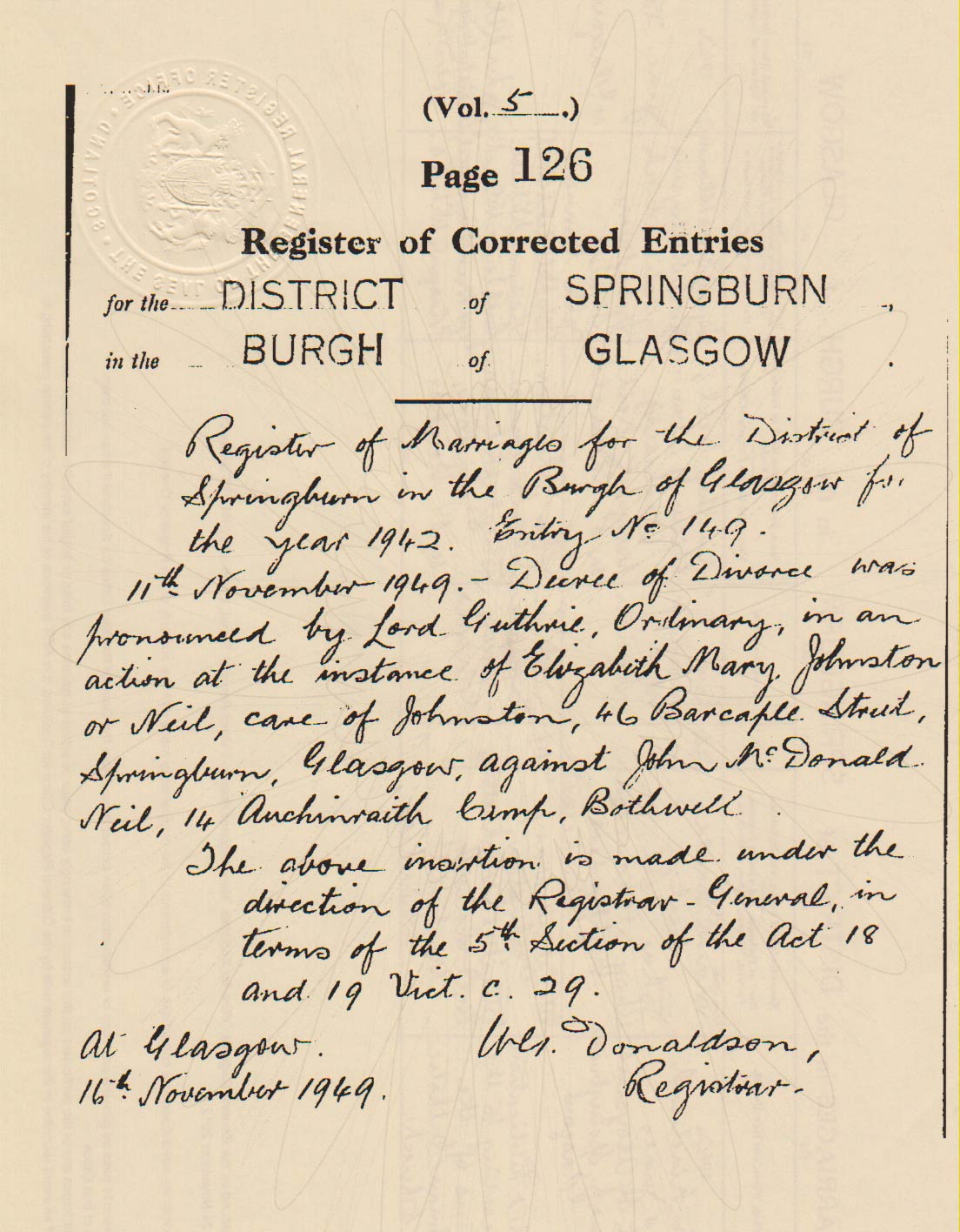 I SSMR source_N085b.jpg Divorce Decree of Divorce between John McDonald Neil & Elizabeth Mary Johnston, 11/11 1949 11 11 1949