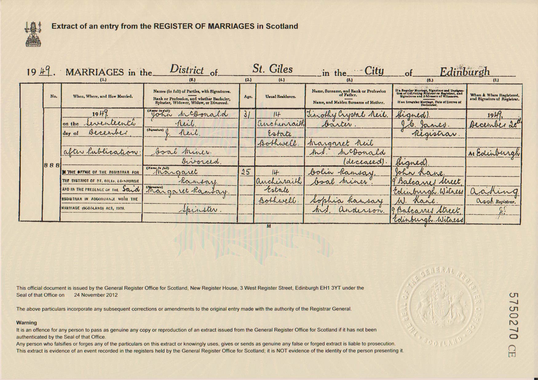 E SSMR source_N086.jpg Marriage Marriage ofJohn McDonald Neil and Margaret Ramsay 17th December 1949 17 12 1949