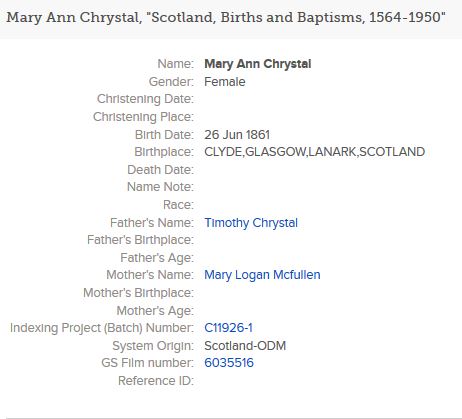 WS IGI source_N093.jpg Birth Birth of Mary Ann Chrystal 26th June 1861 26 6 1861