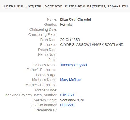WS IGI source_N095.jpg Birth Birth of Eliza Caul Chrystal 20 October 1863 20 10 1863