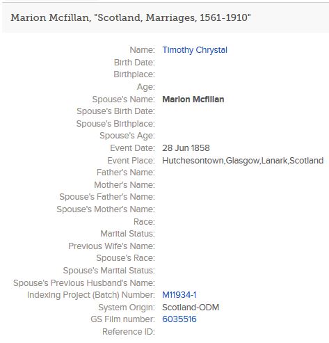 E IGI source_N097.jpg Marriage Marriage of Timothy Chrystal to Marion Mcfillan 28 June 1858 28 6 1858