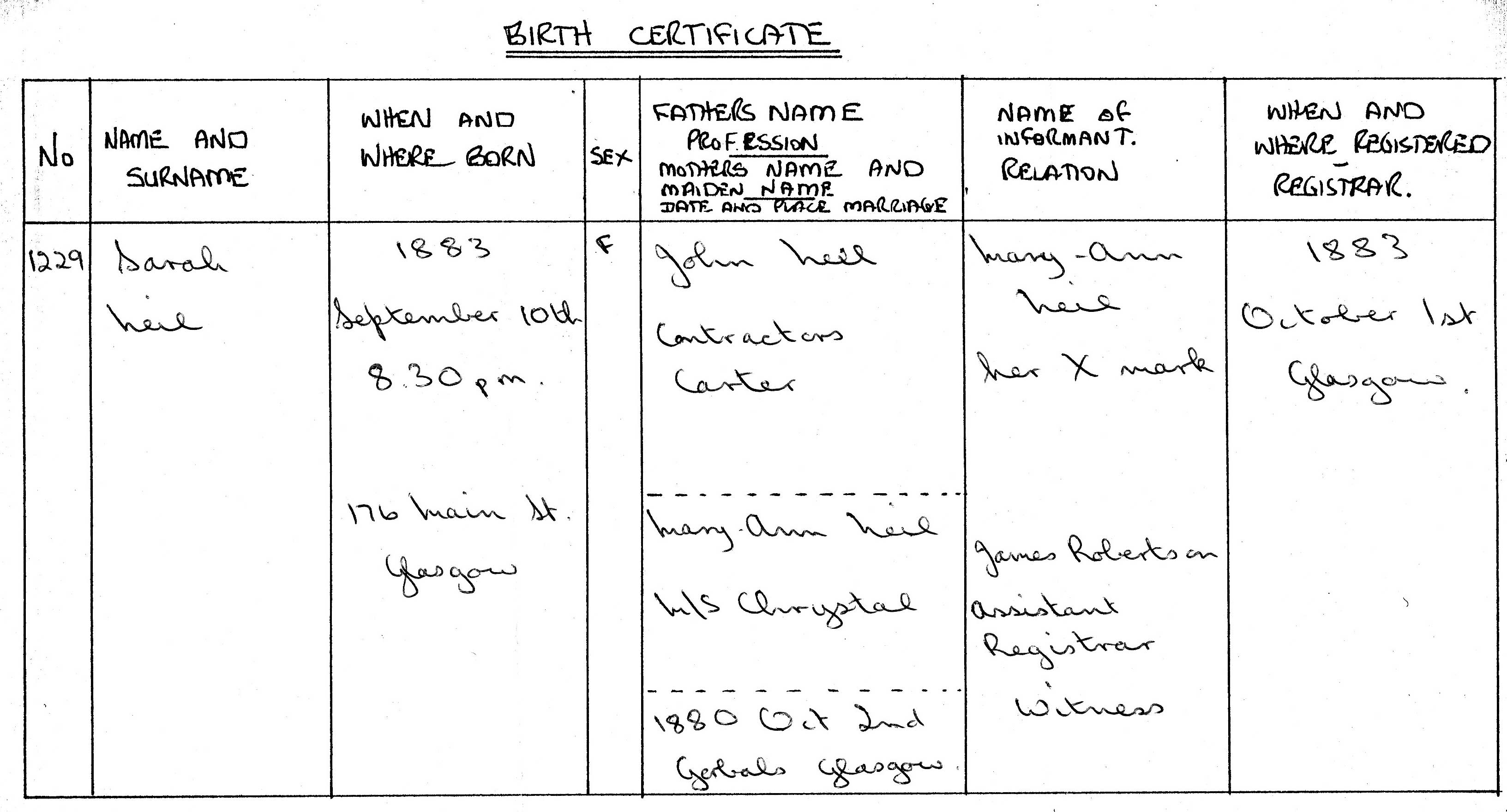 WT SSBR source_N102.jpg Birth Birth of Sarah Neil 10 September 1883 10 9 1883