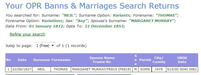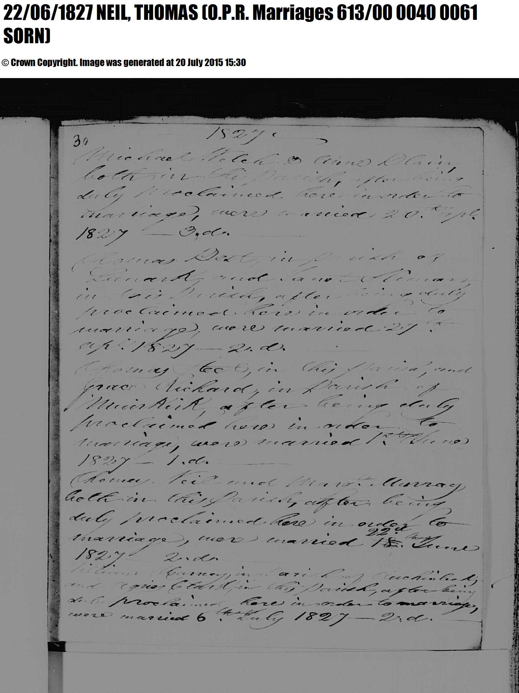 E SSMR source_N113.jpg Marriage Marriage of Thomas Neil to Margaret Murray 22nd June 1827 22 6 1827