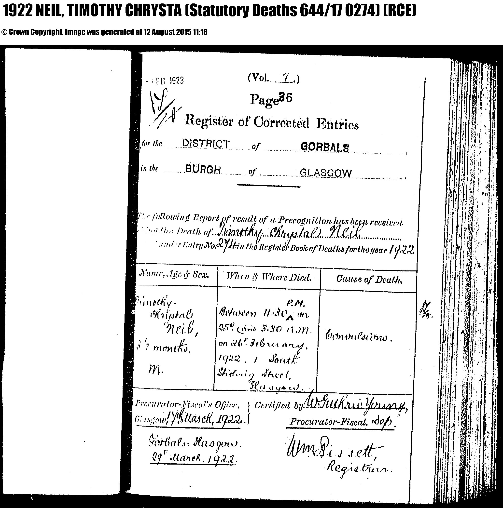 I SRCE source_N122.jpg Death Death of Timothy Chrystal Neil, aged three and a half months, 26th February 1922 26 2 1922
