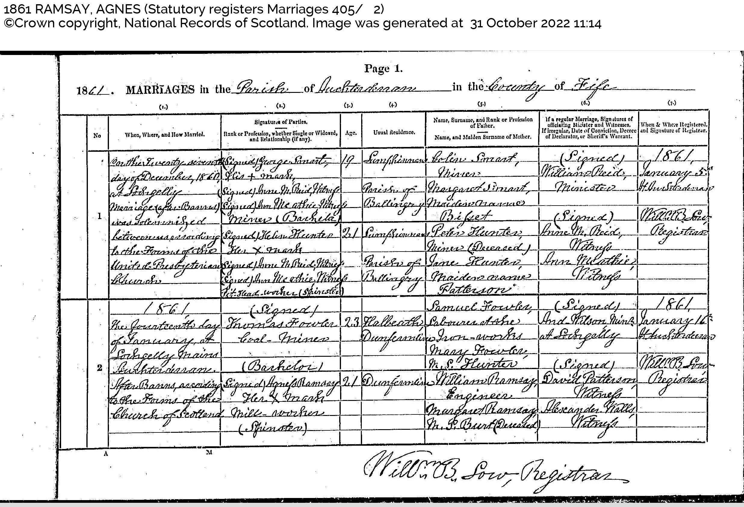 on the 14th of January at Lochgelly Mains, Auchterderran, after Banns according to the Church of Scotland, [were married] Thomas Fowler, Bachelor, Coal Miner, aged 23, Usual Residence Halbeath, Dunfermline. Son of Samuel Fowler, Labourer at the Iron-works AND Mary Fowler M.S. Hunter. AND Agness Ramsay, Spinster, Mill-worker, aged 21, Usual Residence Dunfermline. Daughter of William Ramsay, Engineer AND Margaret Ramsay M.S. Burt (Deceased) Minister And(rew) Wilson Min(iste)r at Lochgelly. Witnesses David Patterson and Alexander Walls. Registered 16 Jan 1861.