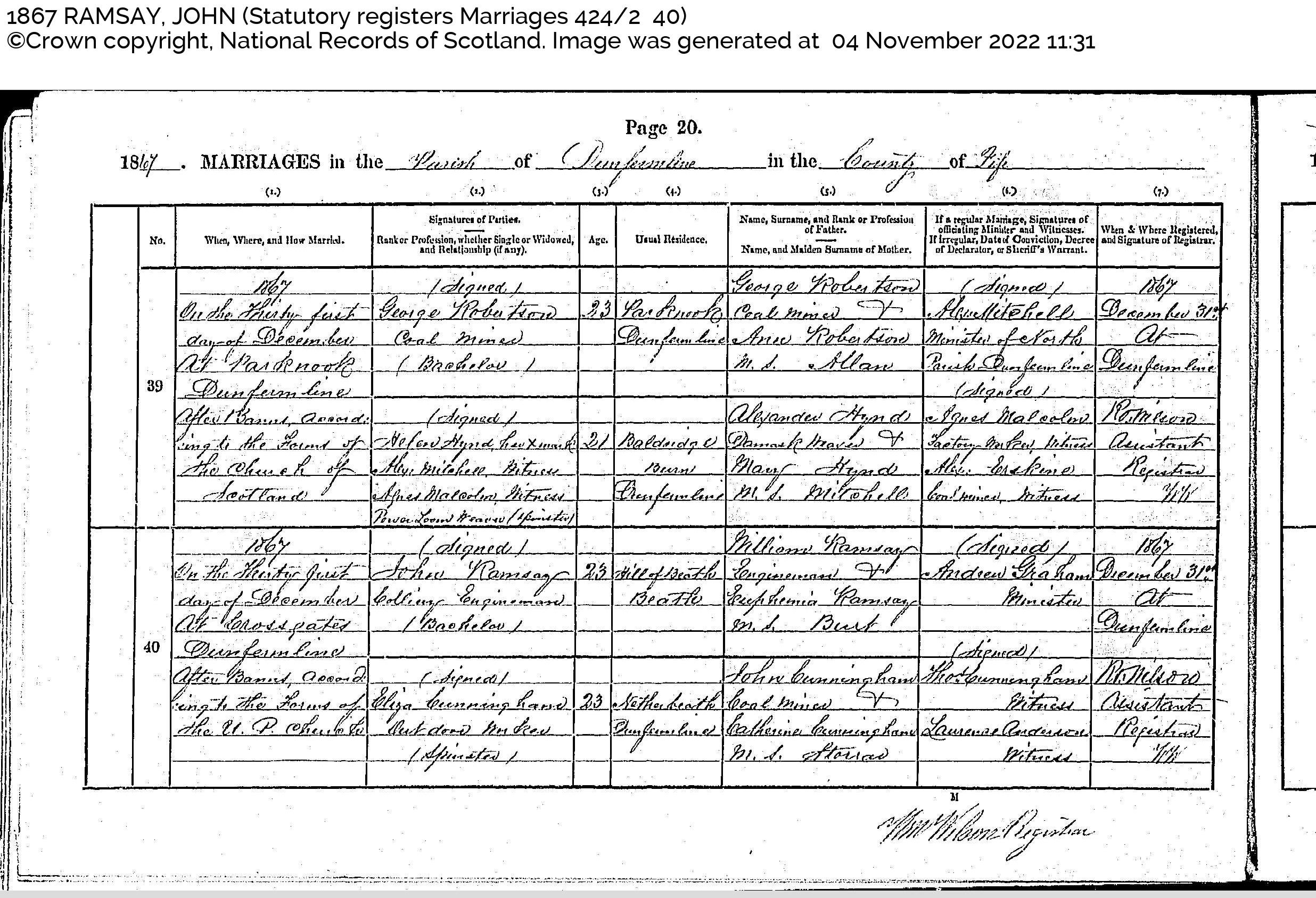 On the 31st day of December 1867 at Crossgates, Dunfermline after Banns according to the forms of the U.P. Church John Ramsay, aged 23, Bachelor, Colliery Engineman. Usual residence: Hill of Beath, Beath. Son of William Ramsay, Engineman and Euphemia Ramsay M.S. Burt