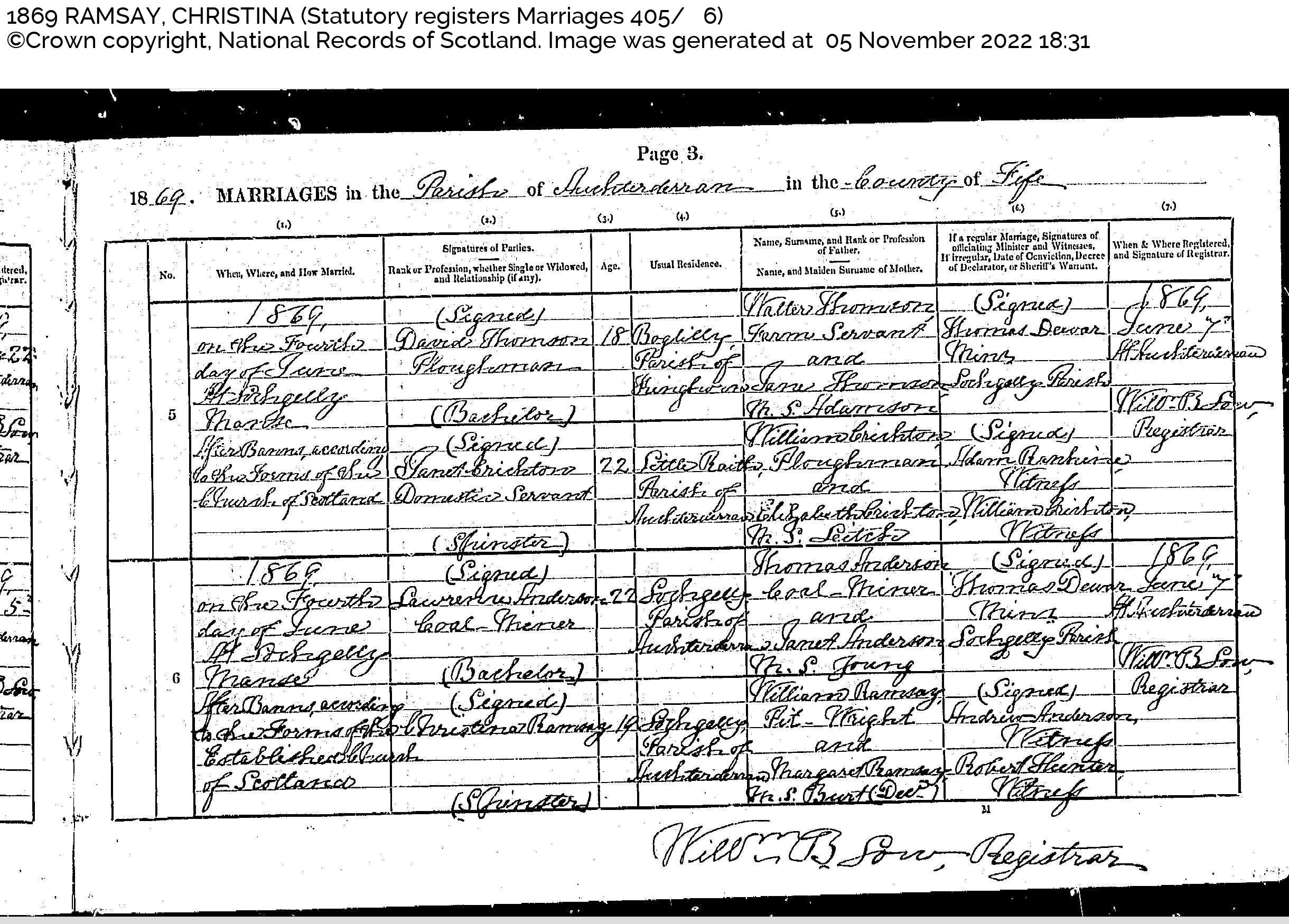 Marriage of Christina Burt Ramsay and Lawrence Anderson 4 June 1869 at Lochgelly Manse
