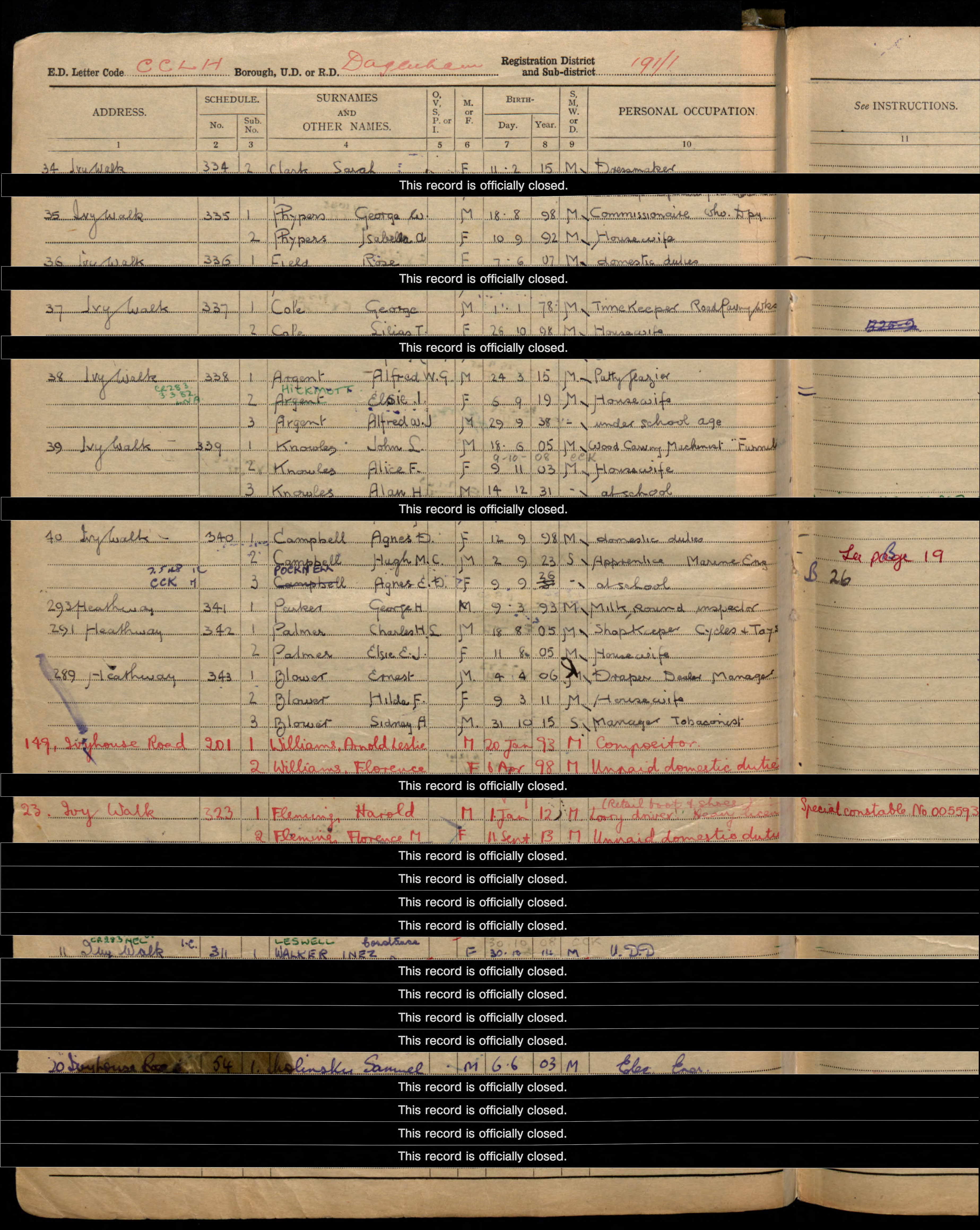 George Cole is 61 (born 1 Jan 1878) and he is a Timekeeper Road Paving Works. Lilias T Cole is 41 (?) but her birth date is given as 26 Oct 1898. (I have it as 22 Oct 1897 and there is a Scotland’s People index entry for that year) which presents a bit of a problem. They are living at 37 Ivy Walk, Dagenham, Essex. She is a housewife.