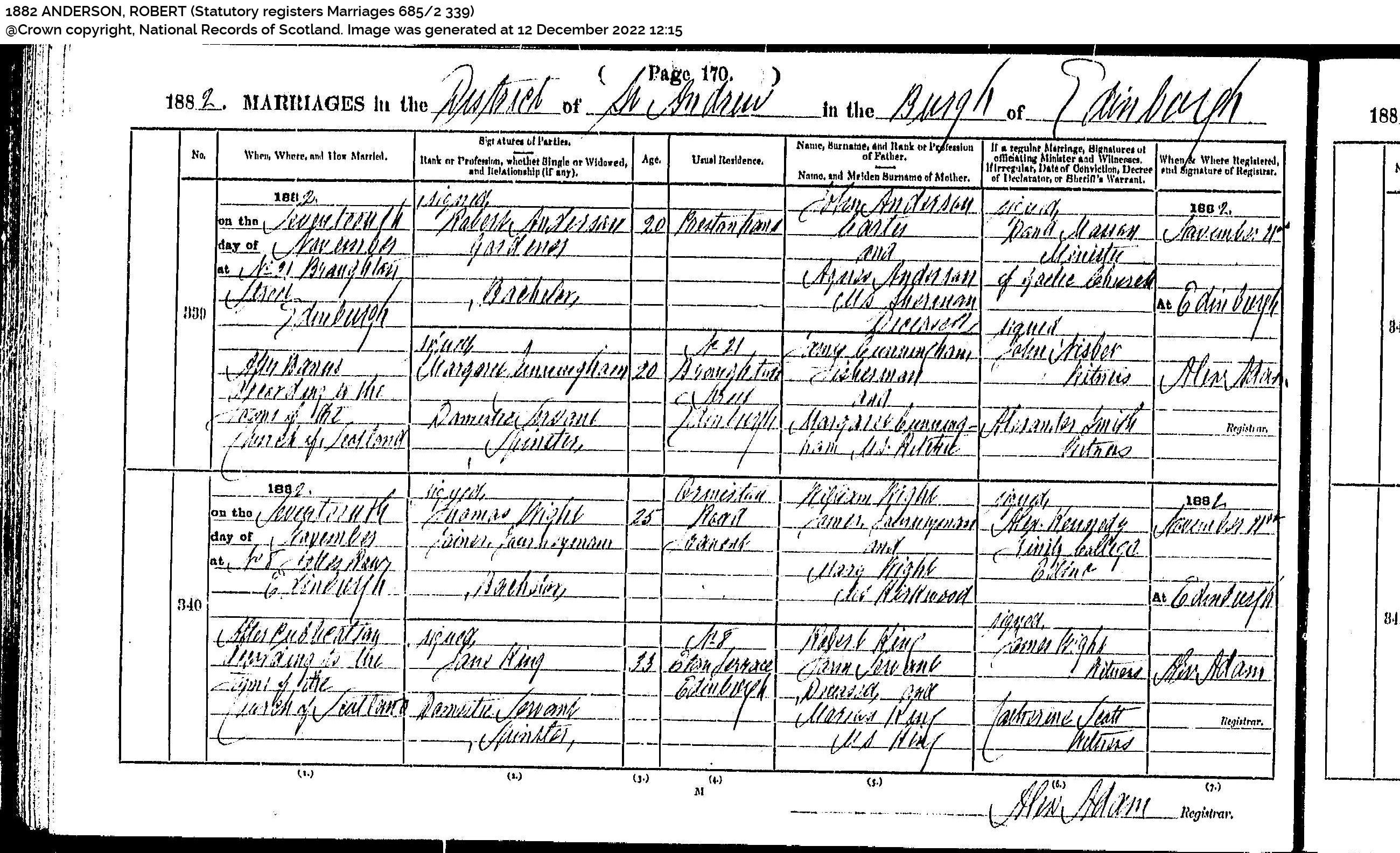 Robert Anderson married Margaret Cunningham 17 November 1882 at 21 Broughton Street, Edinburgh. He was the son of John Anderson (a carter) and Agnes Shearman. Margaret was the daughter of James Cunningham, a fisherman, and Margaret Cunninghm MS Ritchie.