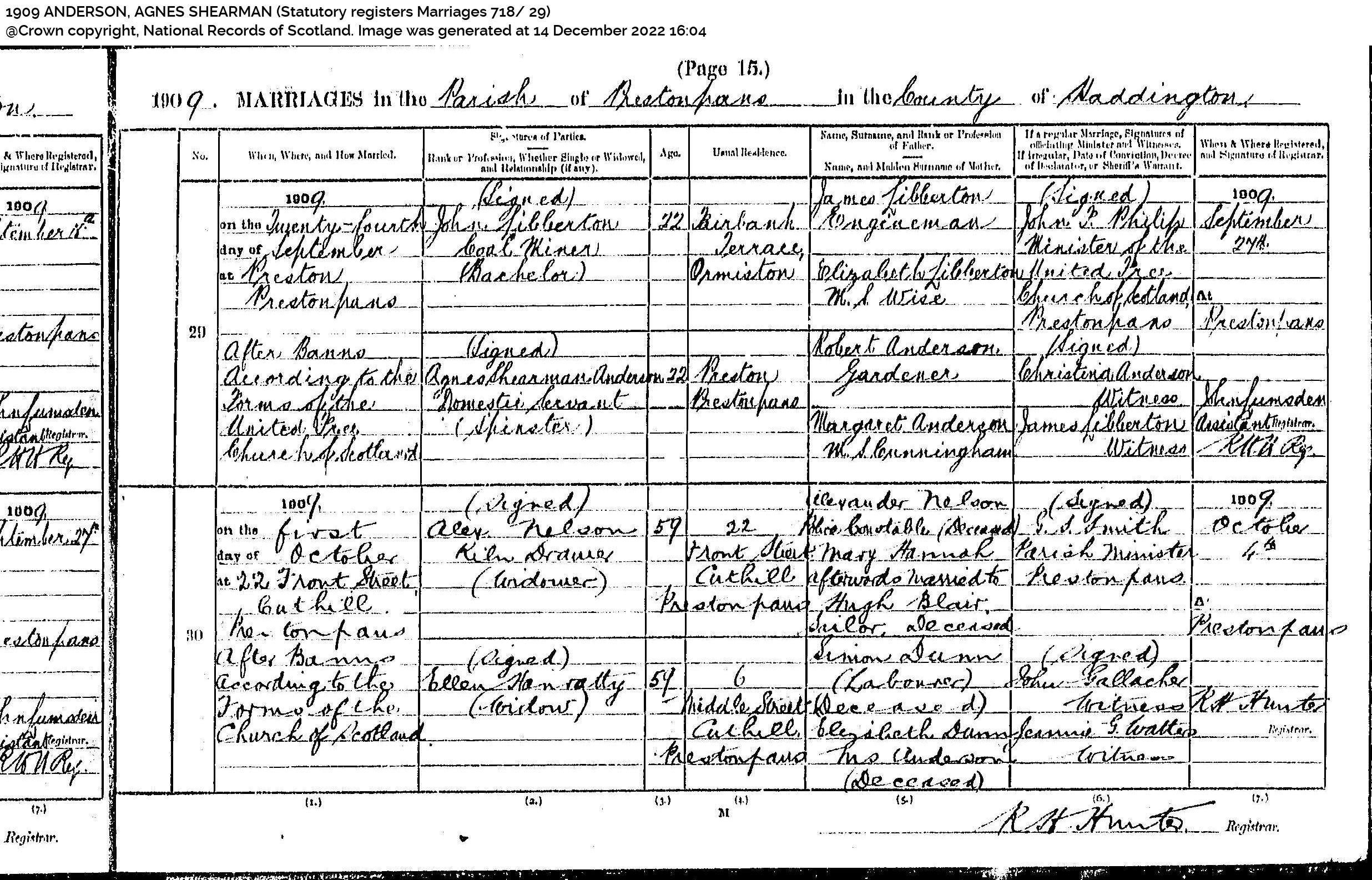 Robert Anderson Gardener Bachelor [aged] 20 [usual residence] Prestonpans [son of] John Anderson Carter and Agnes Anderson MS Shearman Deceased