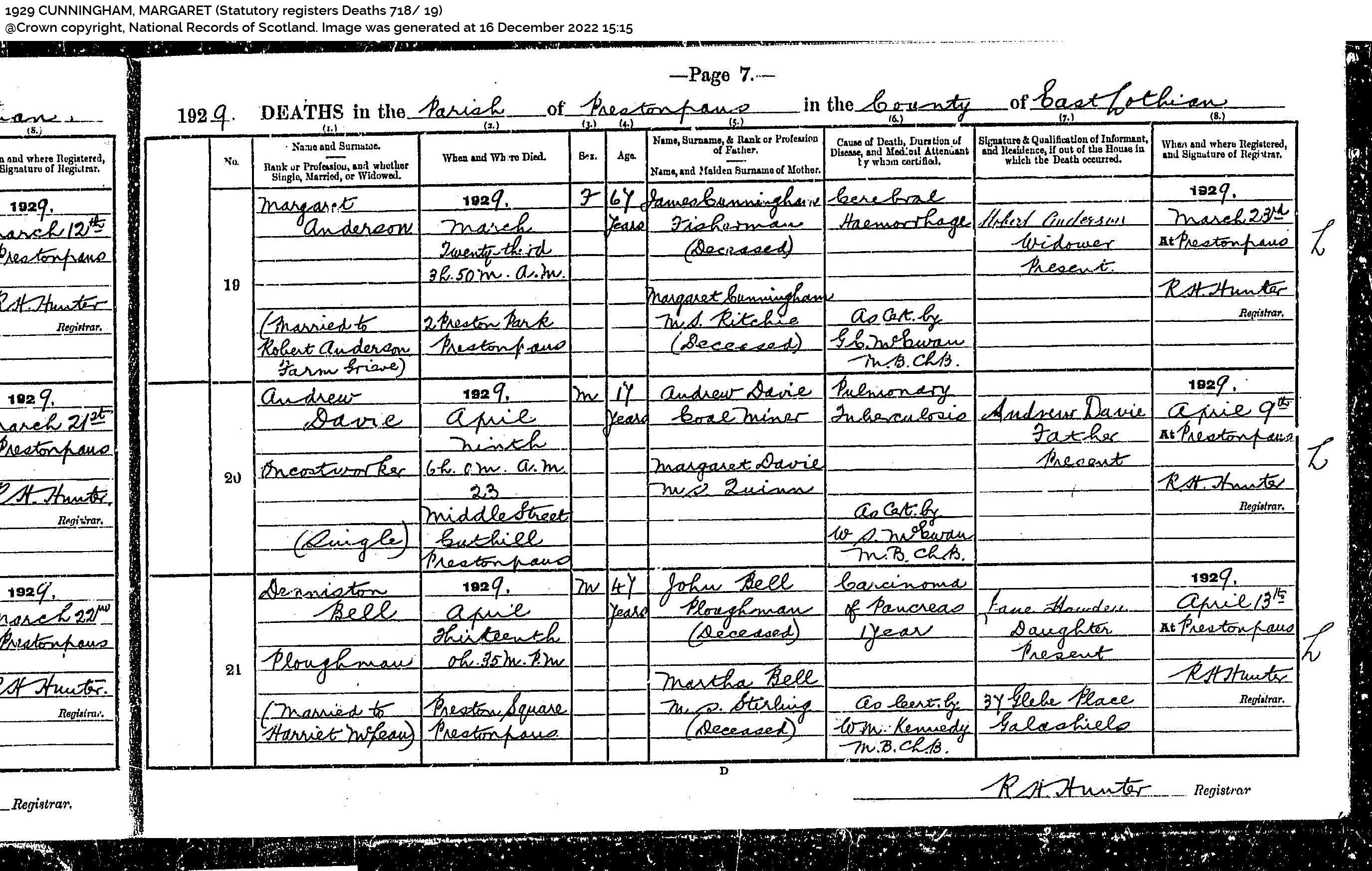 Death of Margaret Anderson or Cunningham 23 Mar 1929