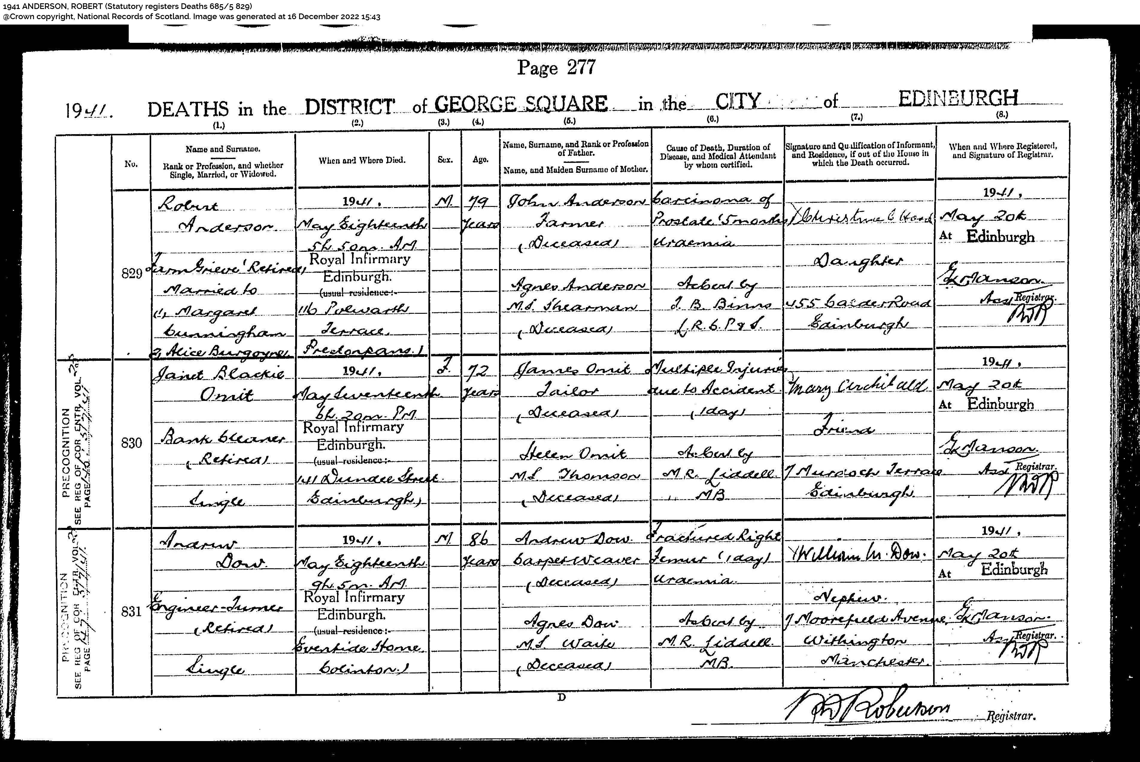 Robert Anderson Farm grieve Retired Married to (1) Margaret Cunningham (2) Alice Burgoyne [died] May 18th 1941 5h 50m AM [at] Royal Infirmary Edinburgh [usual residence] 116 Polwarth Terrace Prestonpans [aged] 79 years [son of] John Anderson Farmer (deceased) [and] Agnes Anderson M.S. Shearman (deceased)