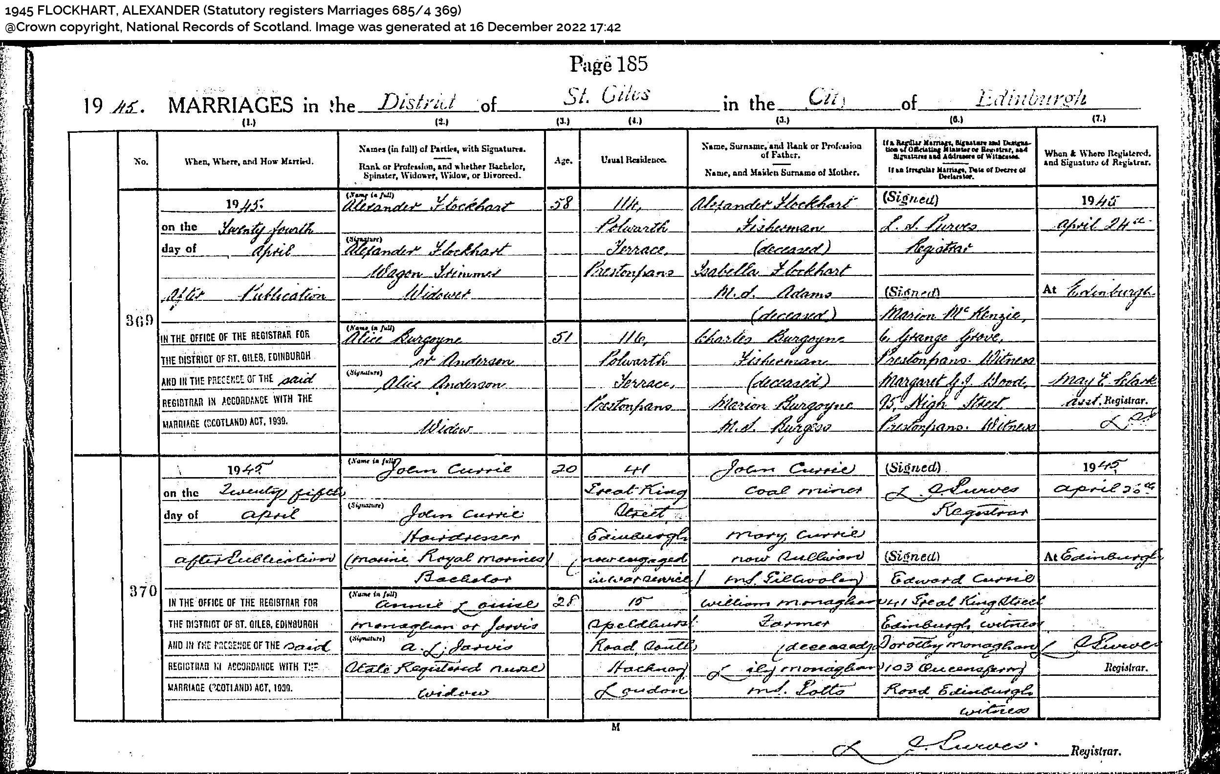 Marriage of Alice Burgoyne to Alexander Flockhart 24 April 1945