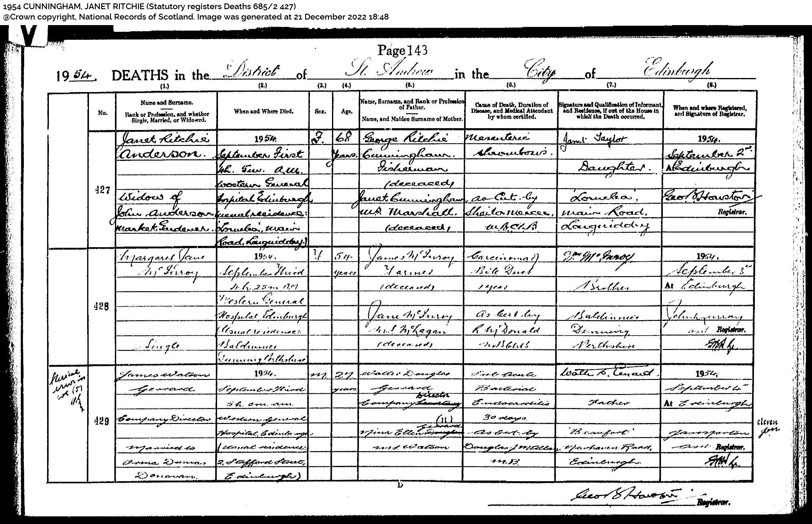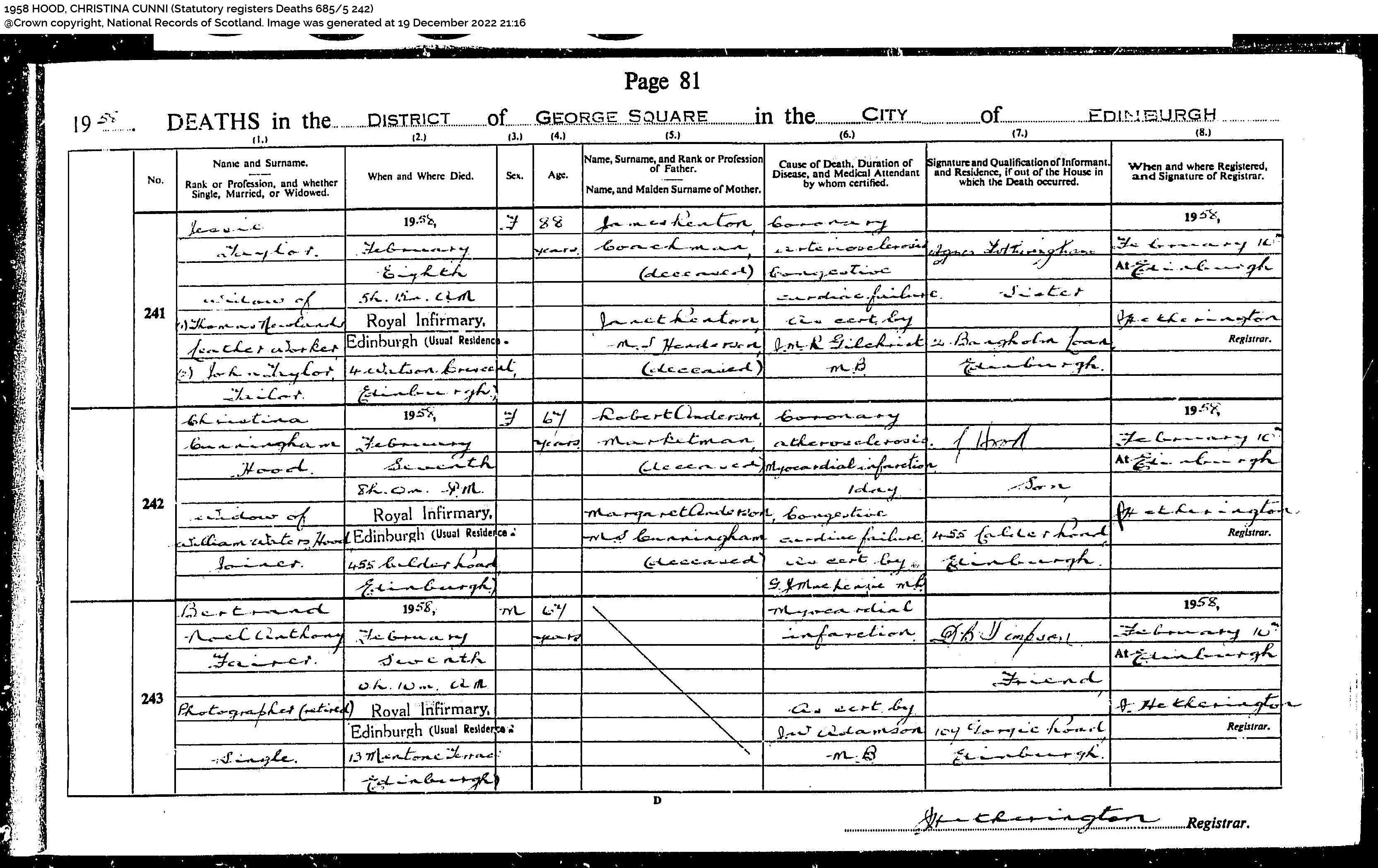 Christina Cunningham Hood, widow of William Waters Hood, Joiner. [died] February Seventeenth 1958 8h 0m pm [at] Royal Infirmary, Edinburgh [usual residence] 455 Calder Road, Edinburgh [aged] 67 years [daughter of] Robert Anderson, Marketman (deceased) [and] Margaret Anderson MS Cunningham (deceased)