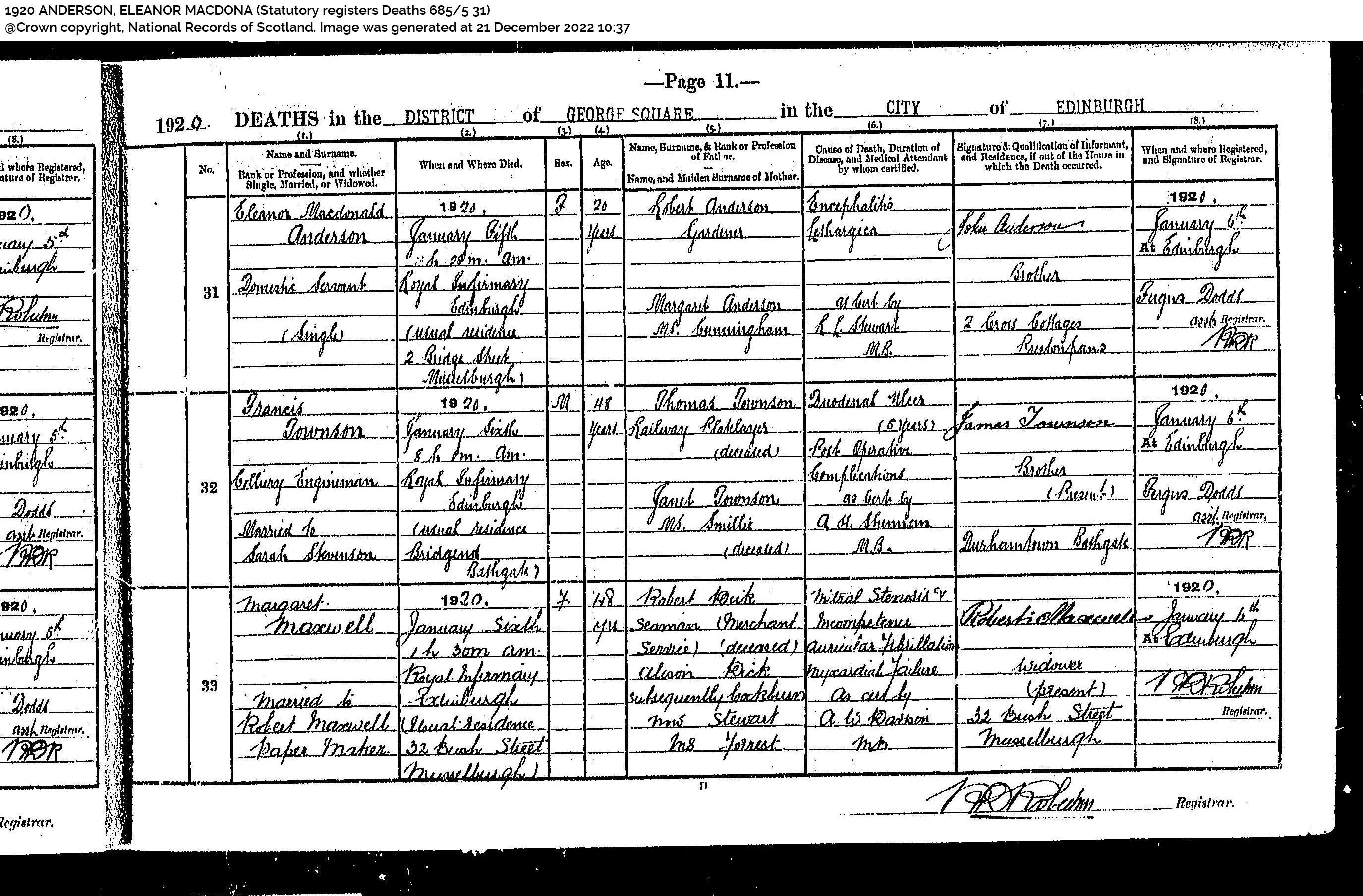 Eleanor MacDonald Anderson, Domestic Servant, Single [died] January Fifth 1920 3h 20m am Royal Infirmary, Edinburgh [usual address] 2 Bridge Street, Musselburgh, [aged] 20 years [daughter of] Robert Anderson Gardener [and] Margaret Anderson MS Cunningham