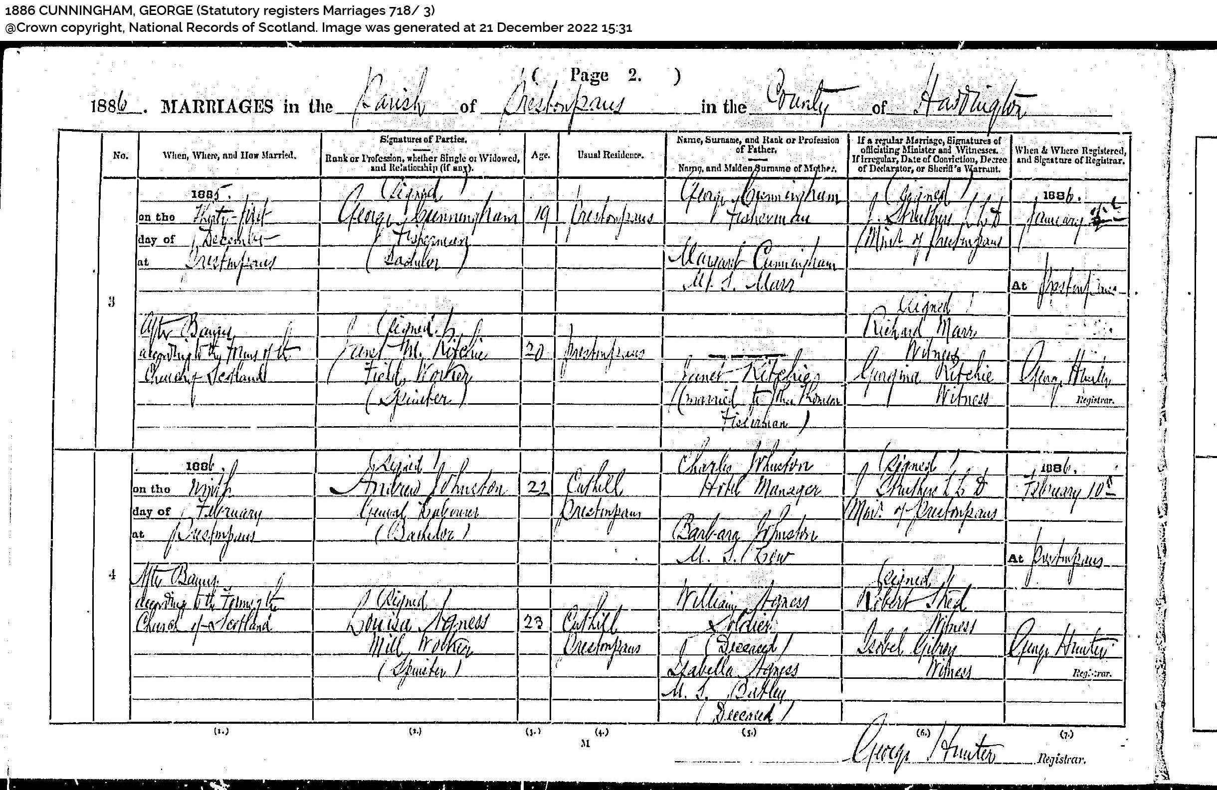 Marriage of Robert Anderson and Margaret Cunningham 17 Nov 1882