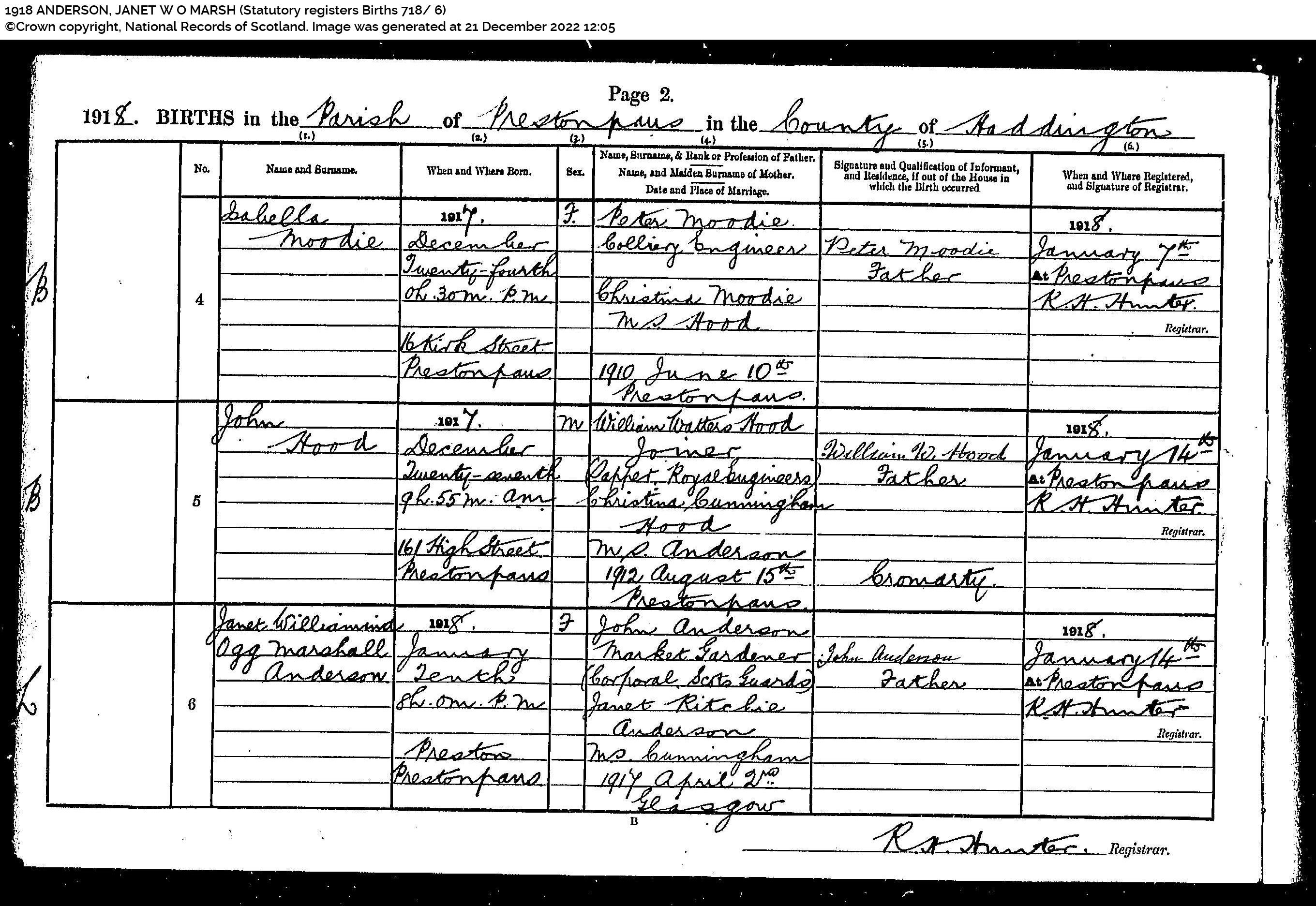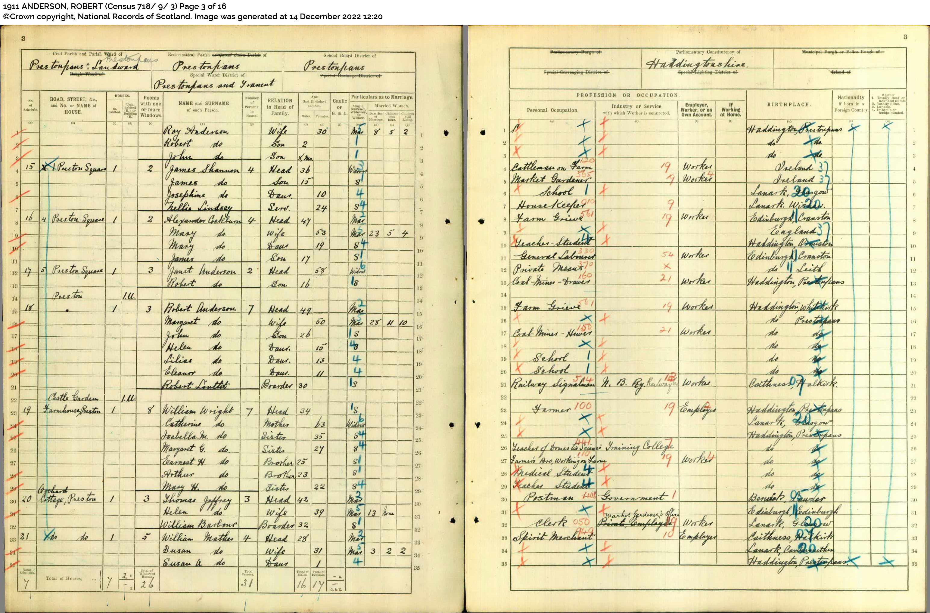 It is worth noting that at the top of this page is part of an entry (it is missing the head of house) The wife is Roy Anderson (sic), aged 36. She has been married 8 years (so married 1903) She has had five children, two of which are still alive. These are Robert aged 2 and John aged 8 months. Mother and children were all born Prestonpans, Haddingtonshire. The most likely candidate here is John Thomas Anderson who married Roy Cunningham in 1902 in Prestonpans. I do not know if this is some relation but it would seem likely.