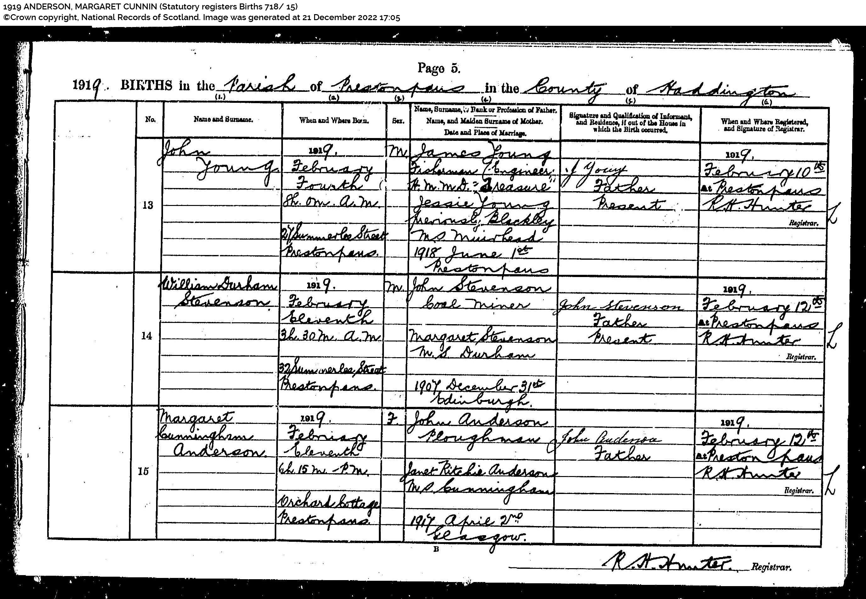 Jemima Cunningham Anderson b. 4 Feb 1894, Prestonpans