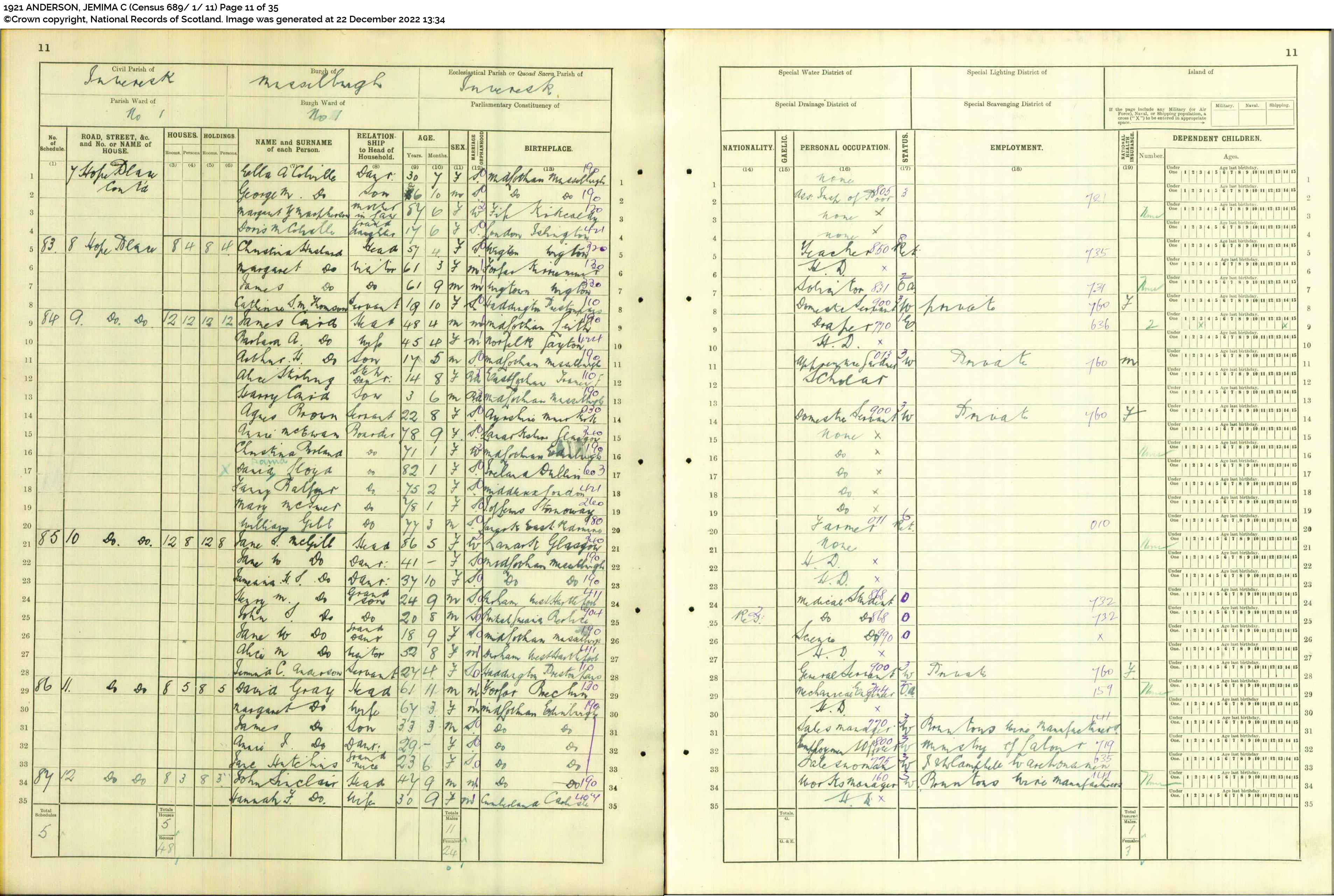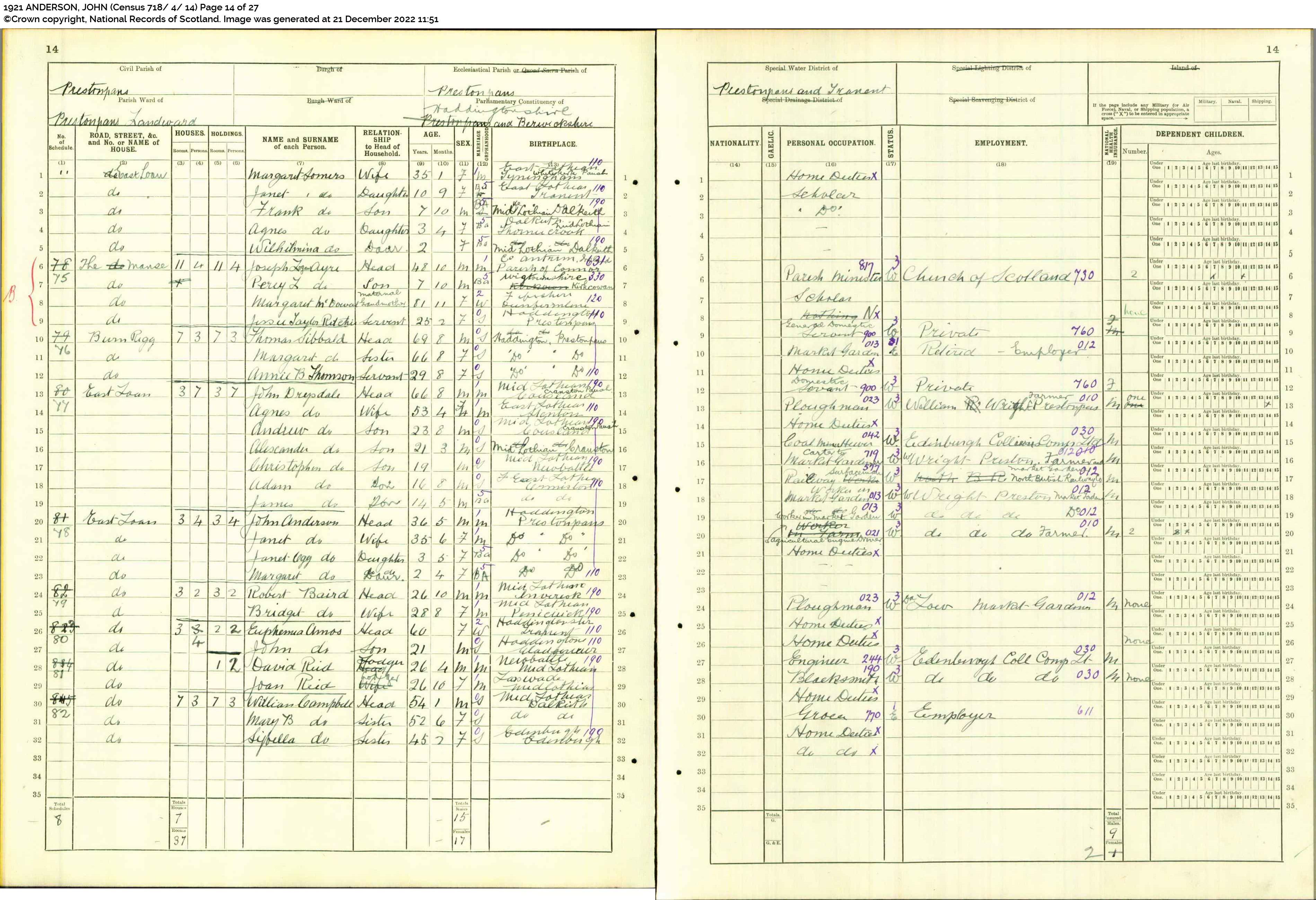 Jemima Cunningham Anderson in the 1921 Census - 10 Hope Dean, Inveresk, Musselburgh.