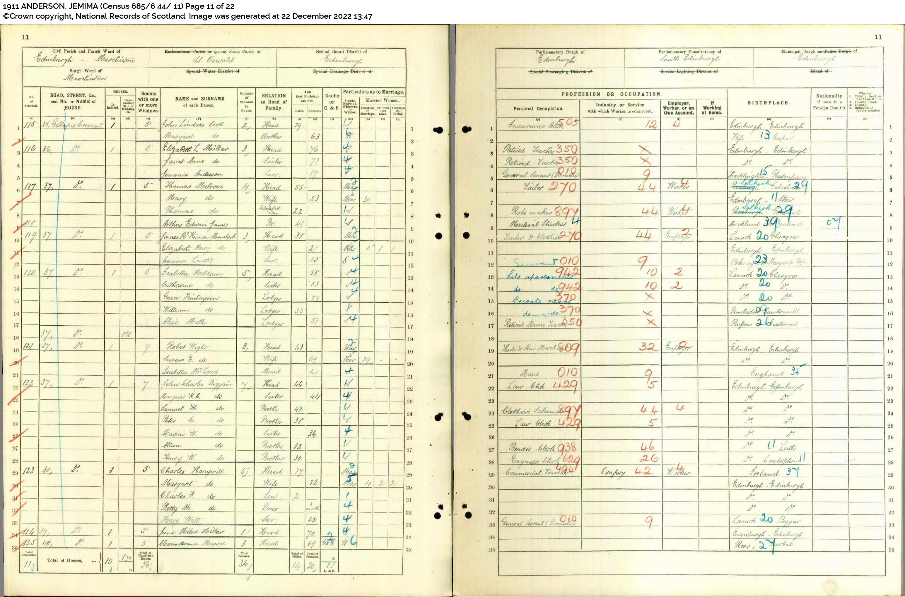 Jemima Cunningham Anderson in the 1911 Census - 36 Gillespie Crescent, Edinburgh
