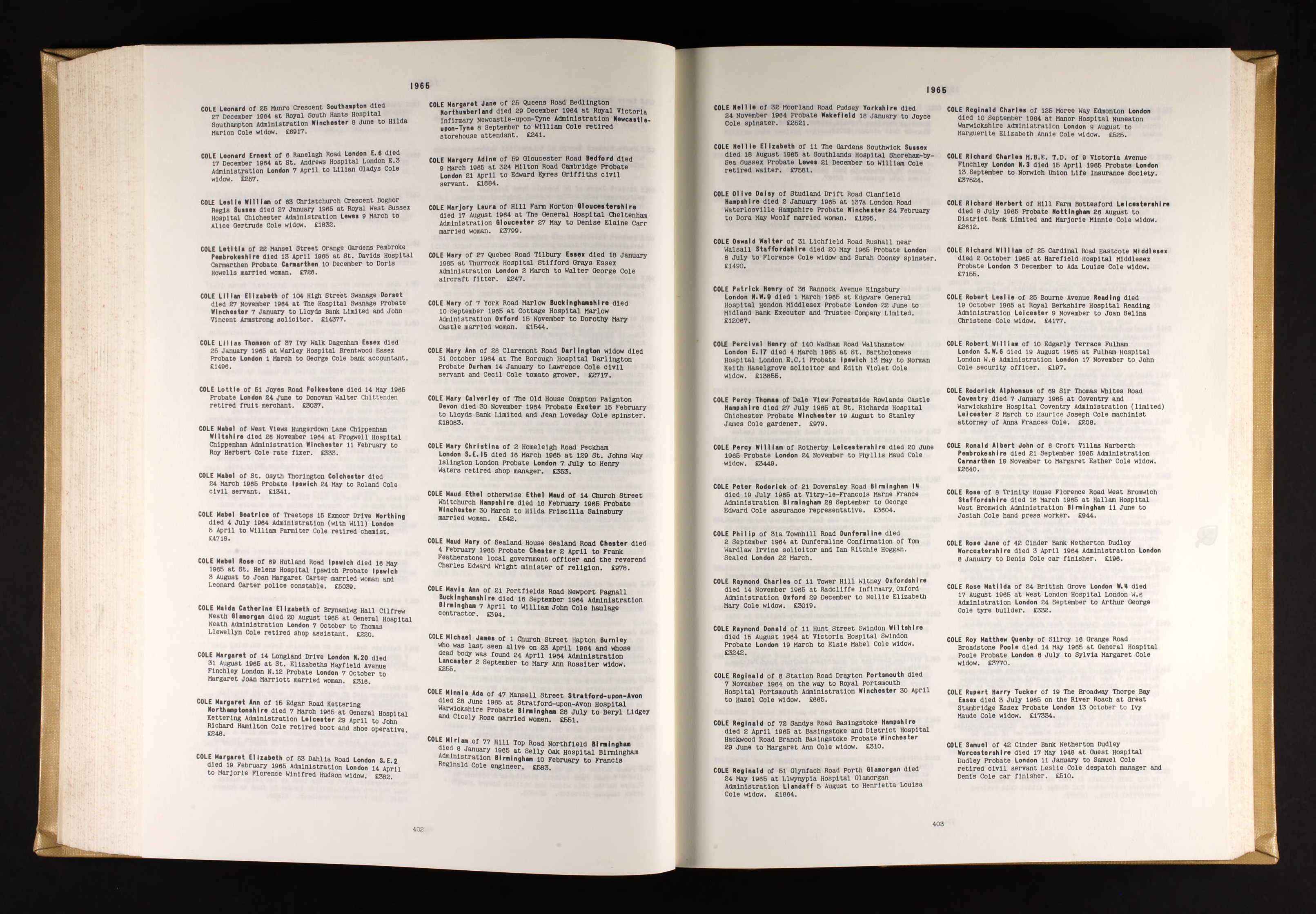 This online source, mentioned above, also quotes an index entry for a marriage Q2 1924 at Bromley Kent to George Cole. There is also a reference to the birth of a son, George Cole 16 April 1925 Limehouse, Middlesex. At her death, her son, George, would have been aged 40 and is perhaps the “bank accountant” mentioned in her probate. Her husband, George, is said to have died 19 Oct 1951 at Dagenham, Essex. The record above says that George's parents were Henry Samuel Cook and Margaret Spotswood. The boy, George, married Gwendolene M Page is Romford, Essex, in Sep 1951)