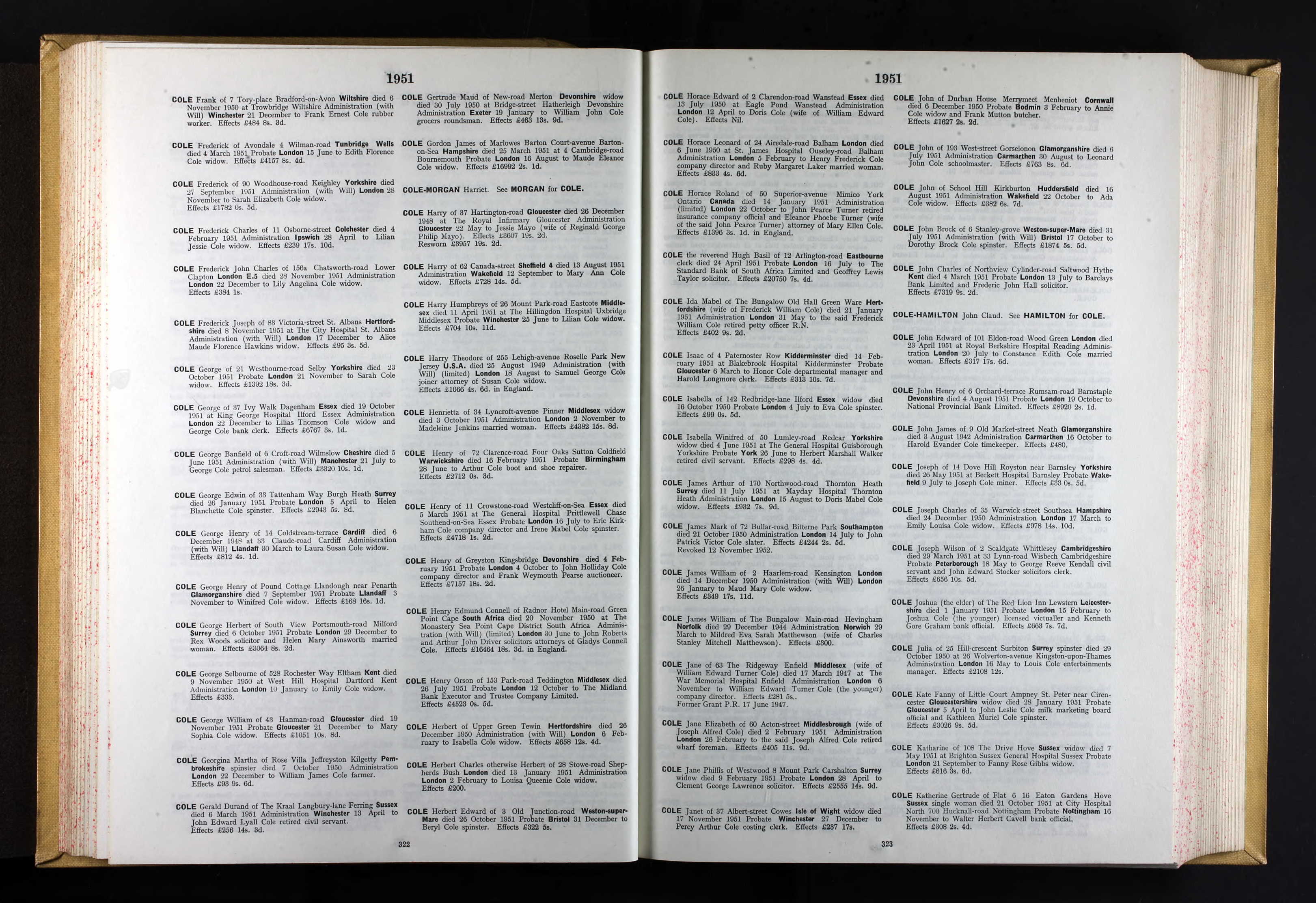 COLE George of 37 Ivy Walk Dagenham Essex died 19 Oct 1951 at King George’s Hospital, Ilford, Essex. Administration London 22 December to Lilias Thomson Cole widow and George Cole bank clerk Effects £6767 10s 1d